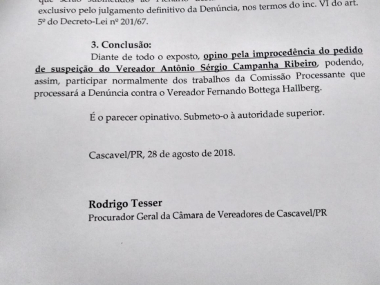 No parecer, Tesser argumenta que “em momento algum o Vereador manifesta-se sobre existência ou não de infração político-administrativa, procedência ou não da Denúncia ou, ainda, sobre a cassação ou não do denunciado”. Cita ainda que o Decreto-Lei nº 201/67, art. 5º, é claro ao reconhecer que os relatórios emitidos pela Comissão Processante são opinativos. “Significa dizer que a Comissão Processante não possui função julgadora, eis que o julgamento definitivo do pedido cabe unicamente ao Plenário da Câmara de Vereadores, seja qual for o entendimento que a Comissão Processante venha a manifestar em seus relatórios”, finaliza.