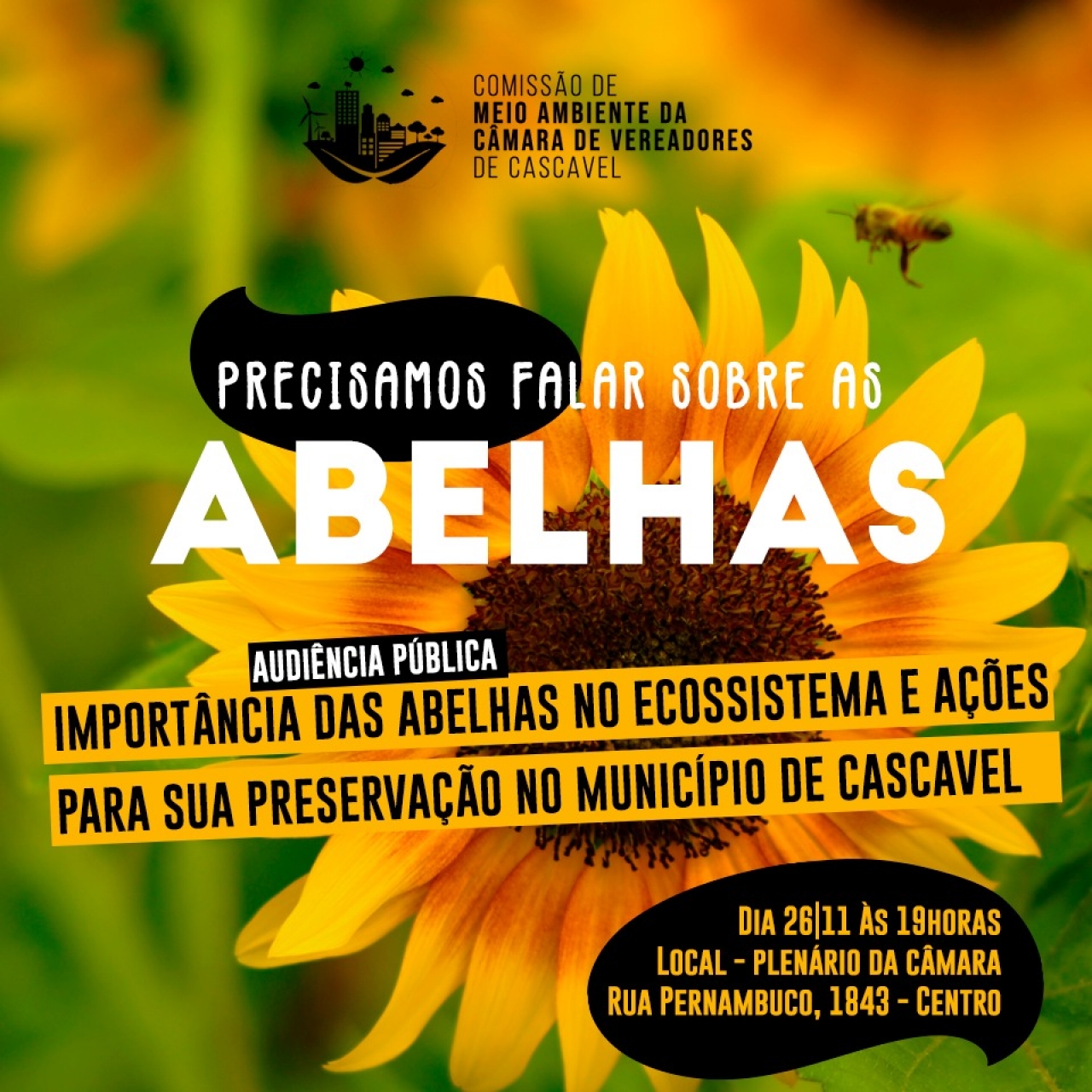 Na próxima terça-feira (26), às 19h, a Câmara promove uma audiência pública para debater a importância das abelhas no ecossistema e ações para sua preservação no município de Cascavel. A audiência é promovida pela Comissão de Meio Ambiente da Câmara, dos vereadores Celso Dal Molin, Paulo Porto e Misael Júnior.