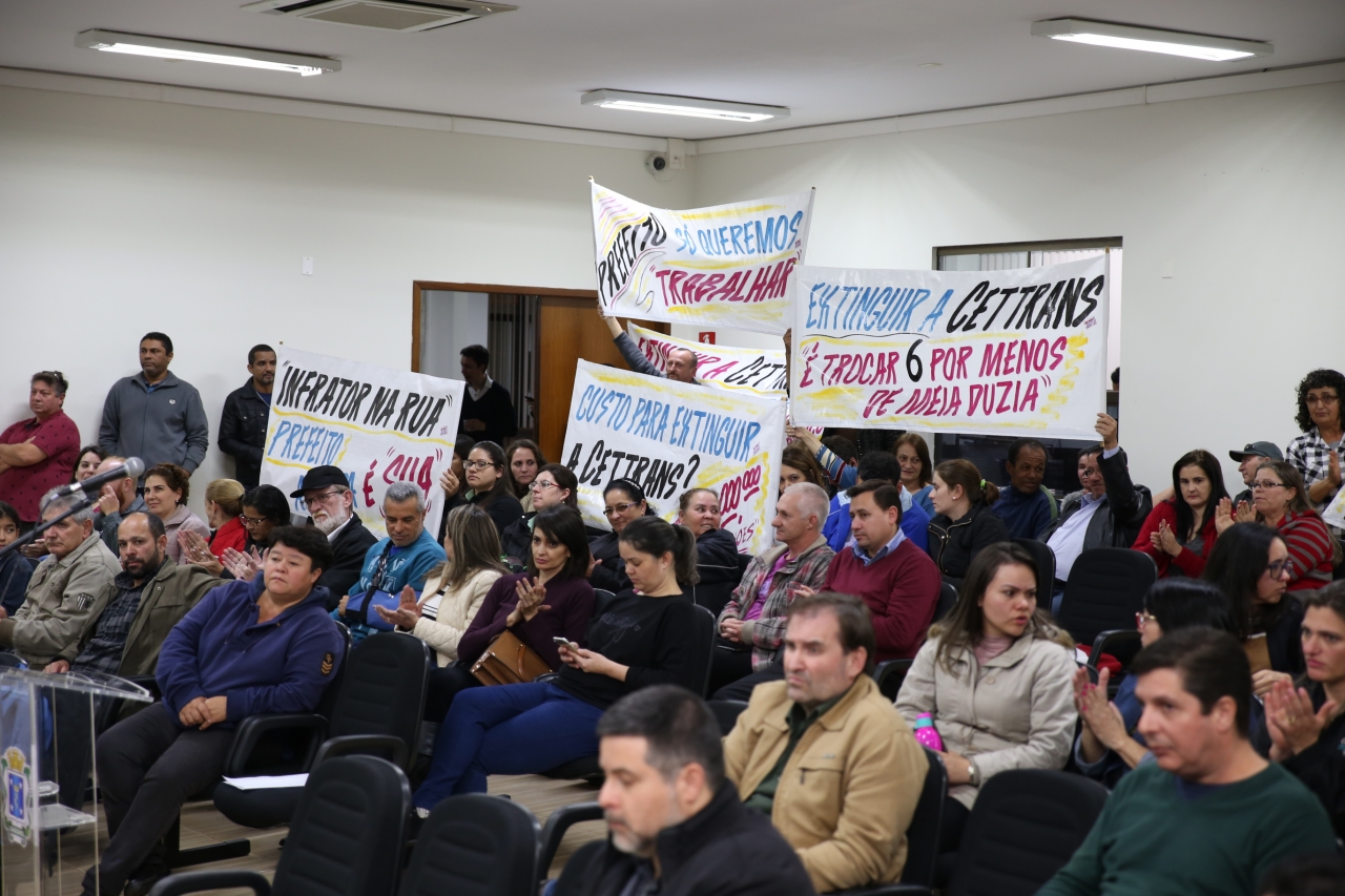 Os vereadores da Comissão de Segurança Pública e Trânsito da Câmara, Fernando Hallberg, Policial Madril e Pedro Sampaio, organizaram uma audiência pública nesta quarta-feira (10) para discutir o Projeto de Lei 57/2019 que prevê a extinção e liquidação da Cettrans (Companhia de Engenharia de Transporte e Trânsito) e criação da Autarquia Municipal de Mobilidade, Trânsito e Cidadania (Transitar). O plenário da Casa esteve lotado durante a audiência com servidores que se trouxeram faixas pedindo a manutenção da companhia. Estiveram presentes ainda os vereadores Mazutti, Parra, Valdecir Alcântara, Paulo Porto, Josué de Souza, Mauro Seibert, Serginho Ribeiro e a vereadora Nadir Lovera.