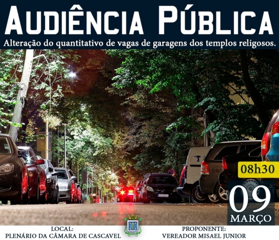 Nesta sexta-feira, 09 de março, às 8h30, a Câmara realiza uma audiência pública para discutir o número de vagas de estacionamento em templos religiosos.