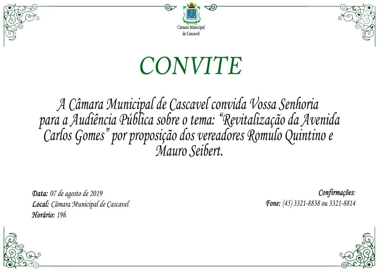 Na próxima quarta-feira (07), às 19h, o plenário da Câmara sedia uma audiência pública para debater junto aos segmentos organizados da sociedade, aos poderes públicos constituídos e à sociedade em geral o tema: “Revitalização da Avenida Carlos Gomes”. A audiência é promovida pelos vereadores Mauro Seibert e Romulo Quintino.