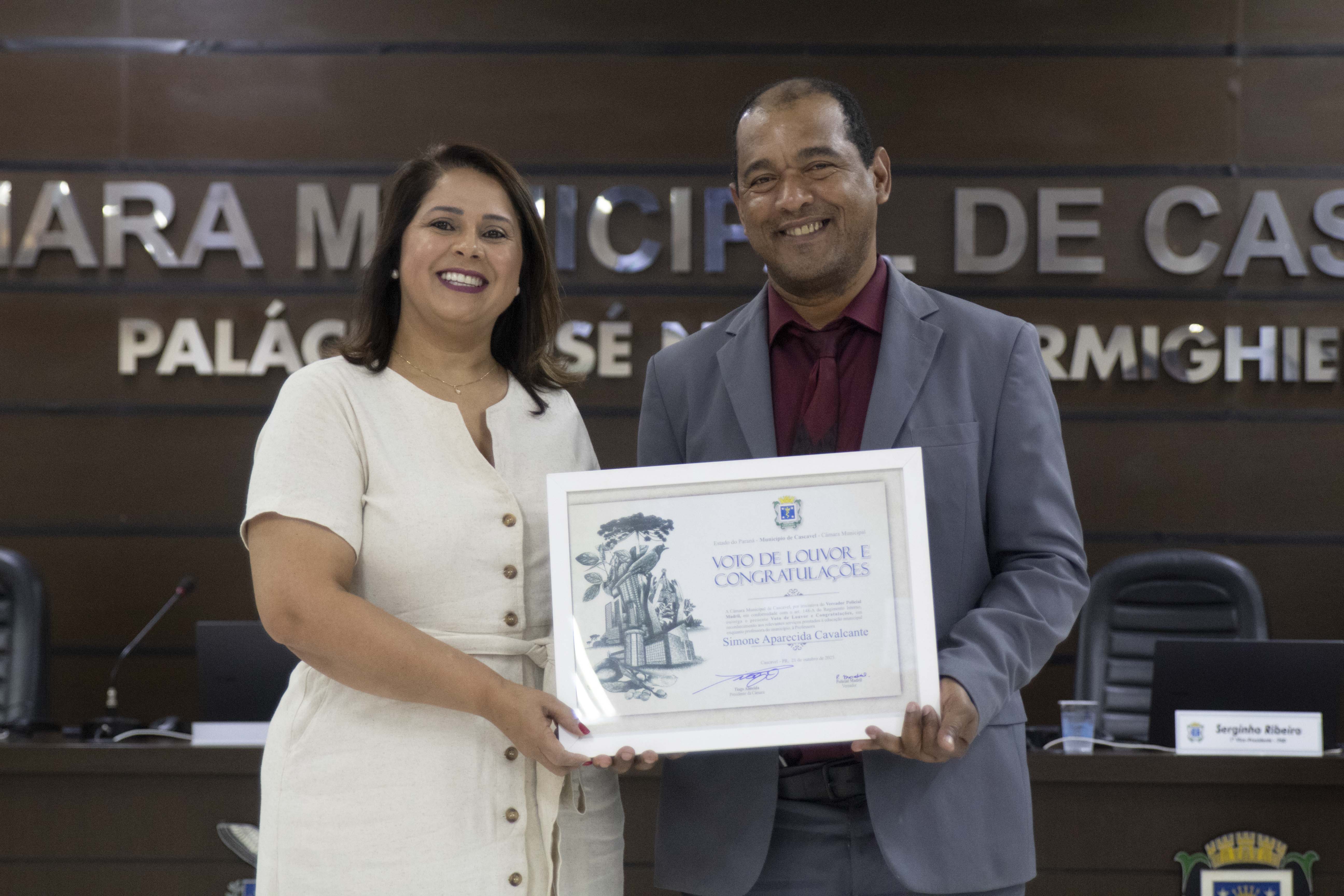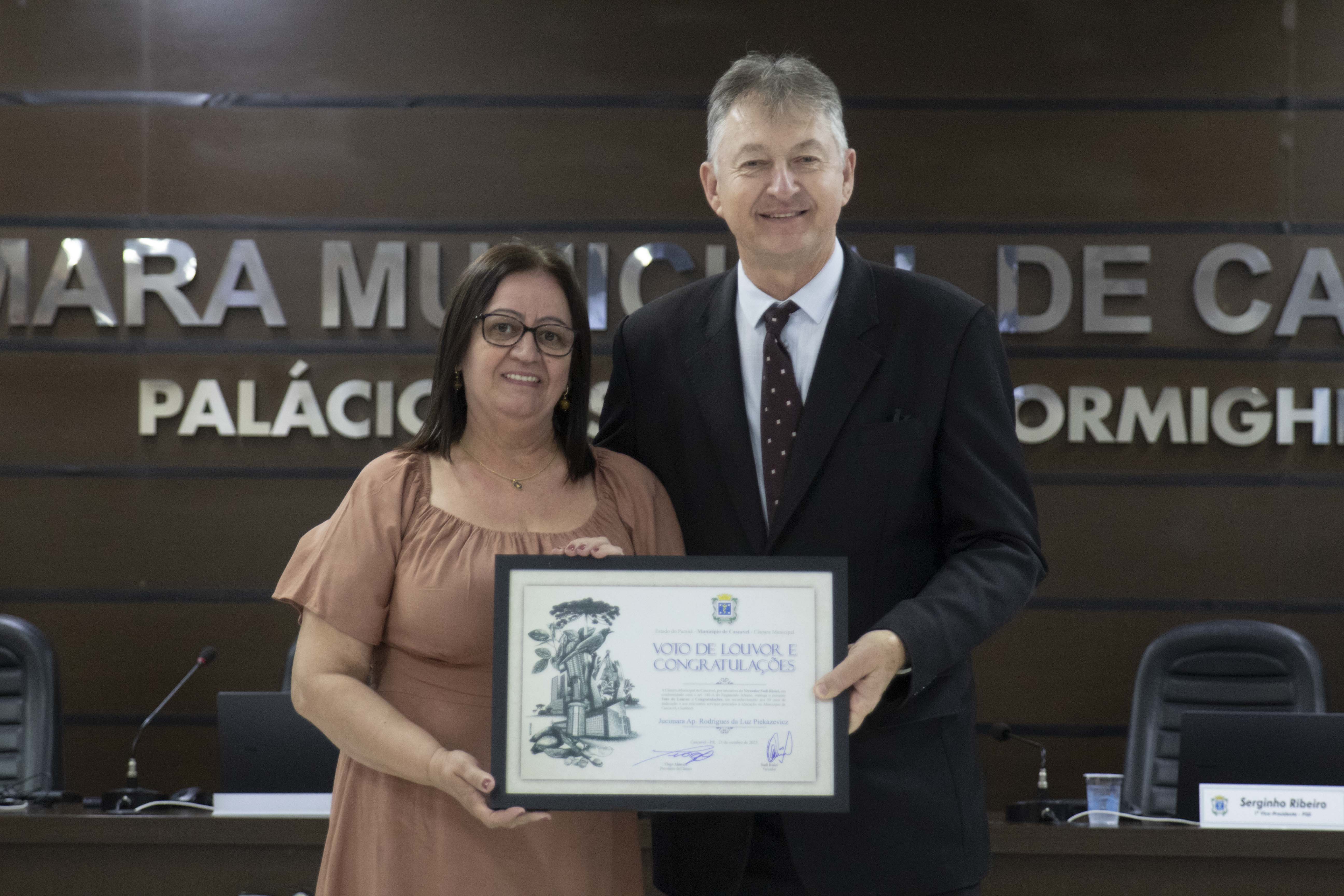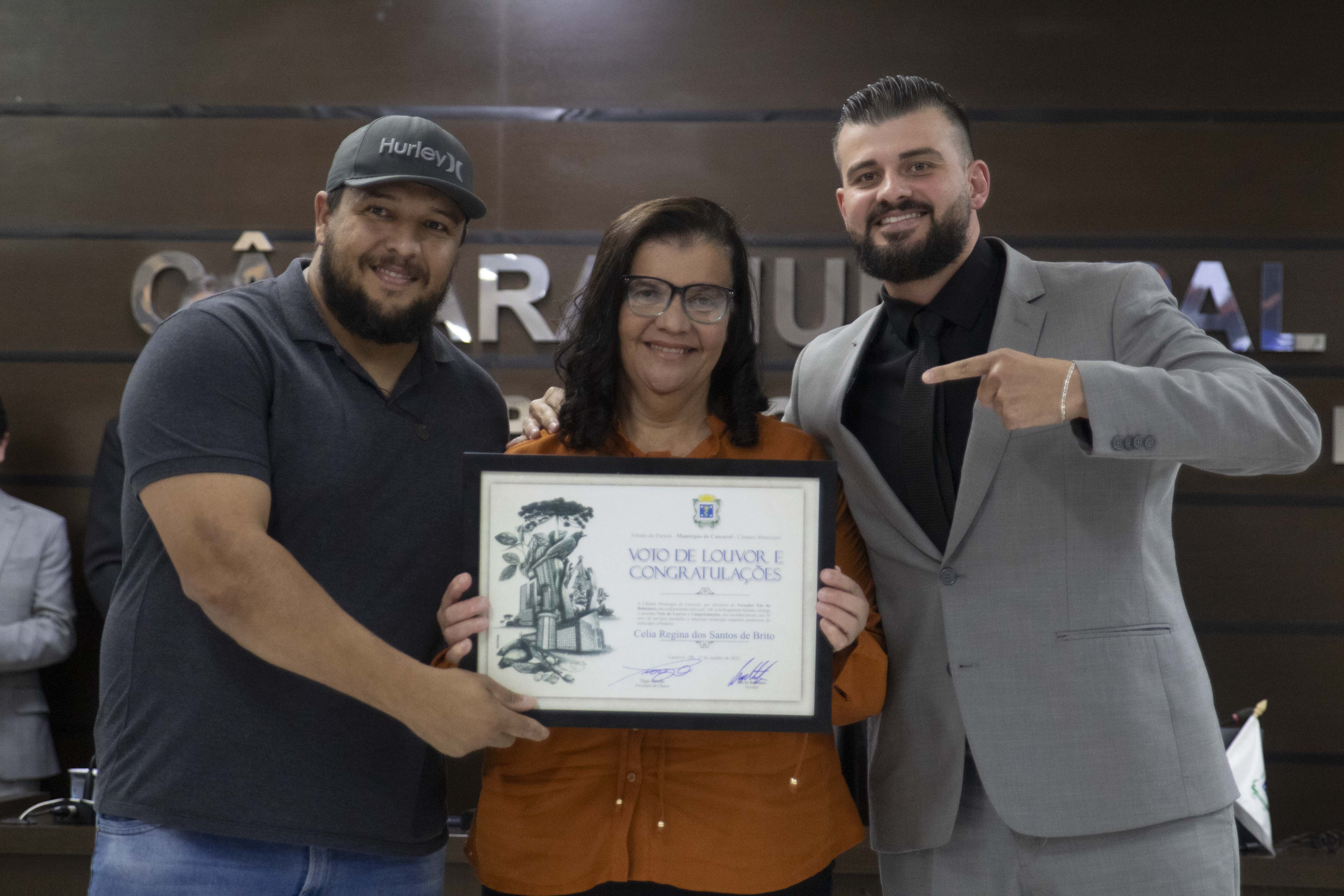 Por proposição do vereador Fão do Bolsonaro, foi homenageada a professora Célia Regina dos Santos de Brito, com 30 anos de serviços prestados ao município, especialmente nos CMEIs Passos Para a Vida e Aracy Lopes Pompeu, ambos no bairro Morumbi.