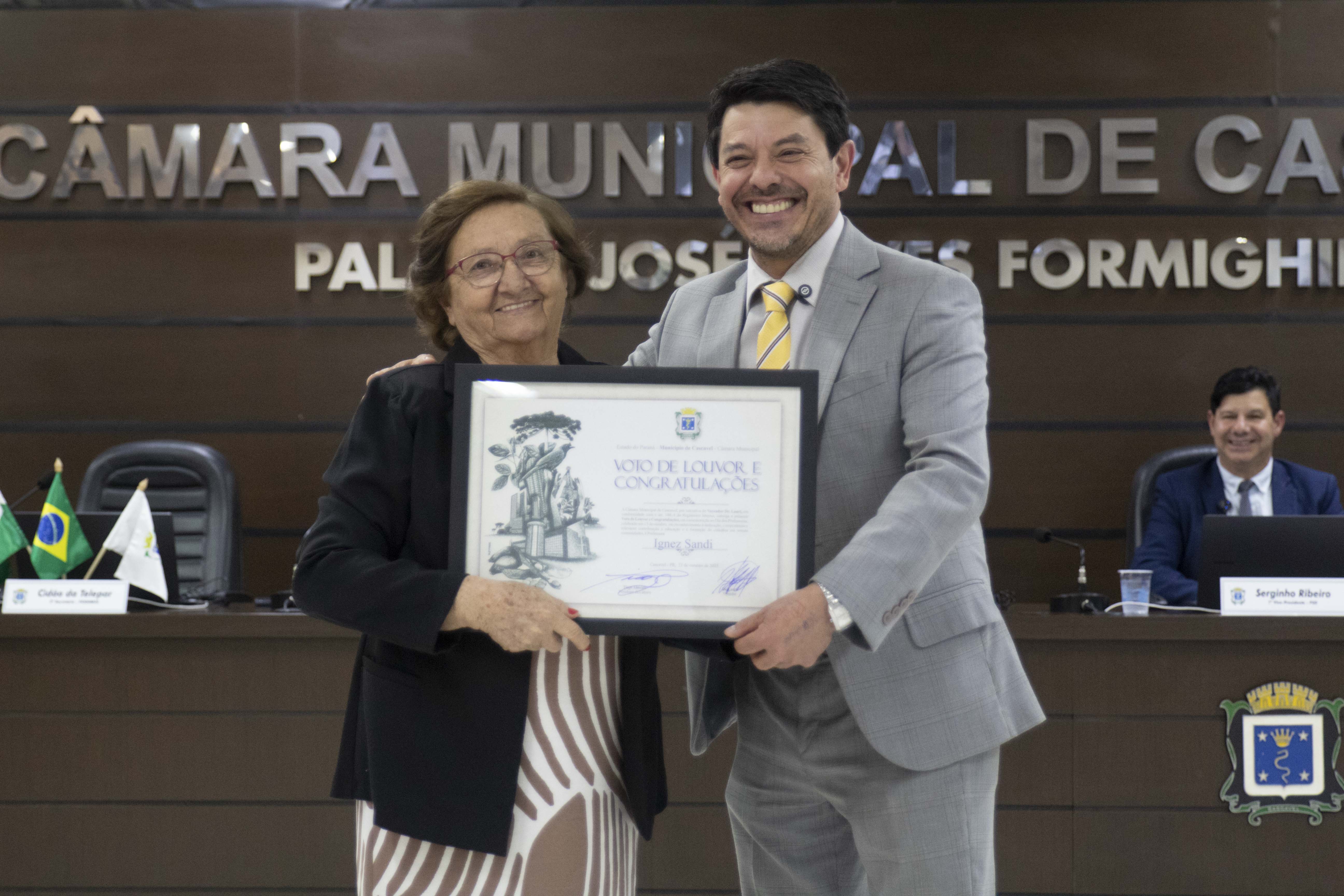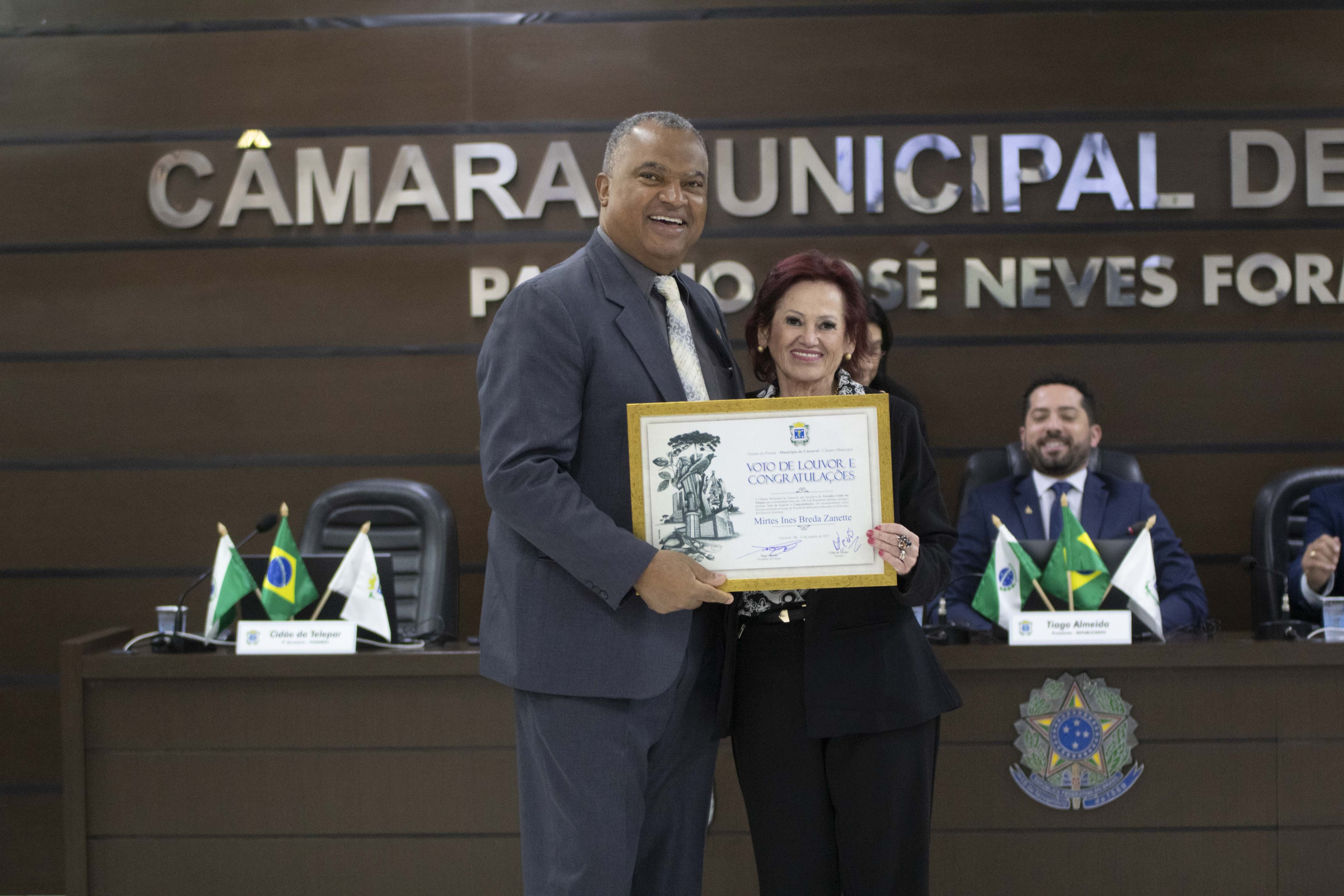 Por proposição do vereador Cidão da Telepar, recebeu a honraria a professora Mirtes Ines Breda Zanette, que iniciou sua carreira na Prefeitura de Cascavel em 1995 e exerceu funções de liderança em escolas como a Manoel Ludgero Pompeu e a Rubens Lopes, sendo reconhecida por sua competência e compromisso com a educação pública.