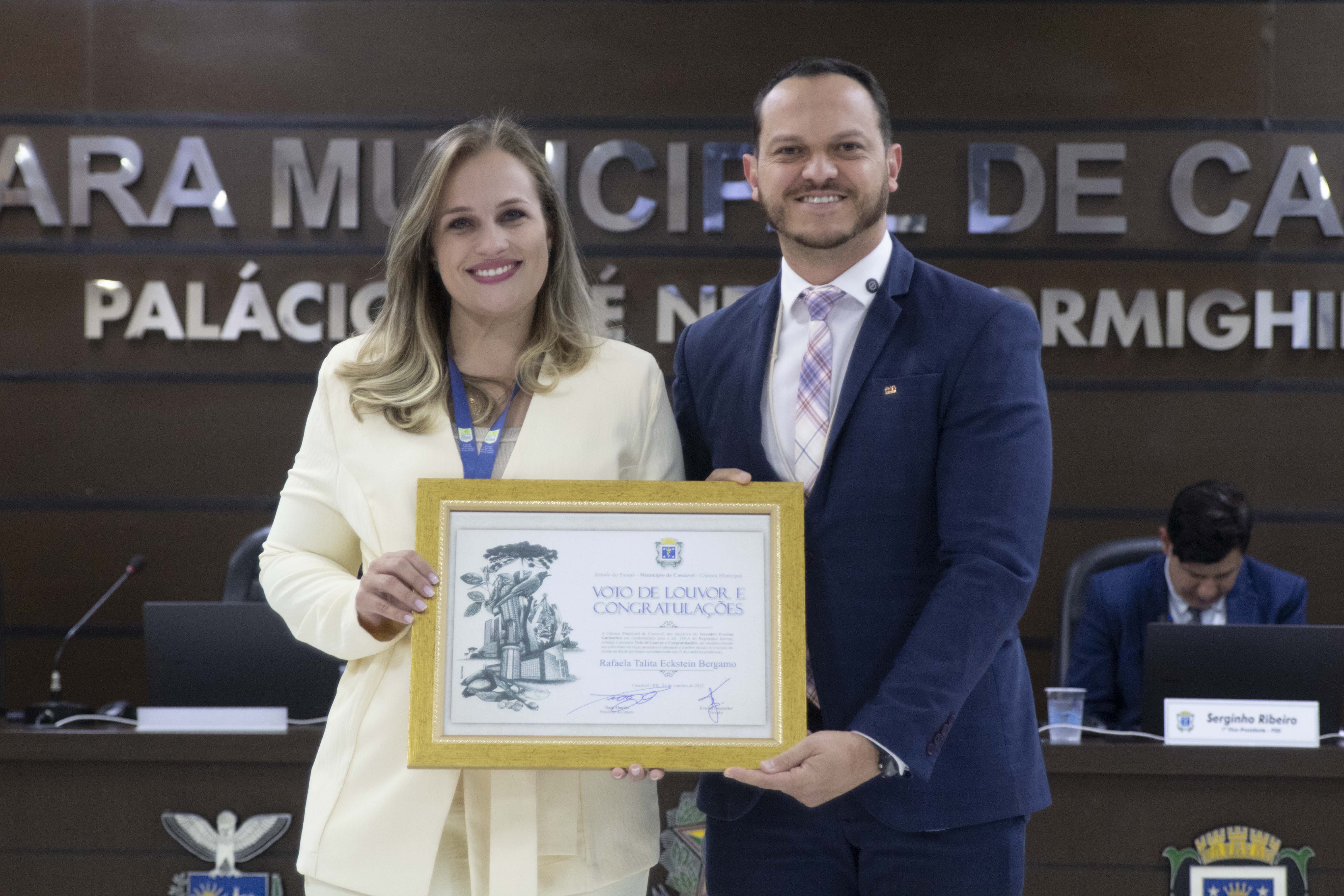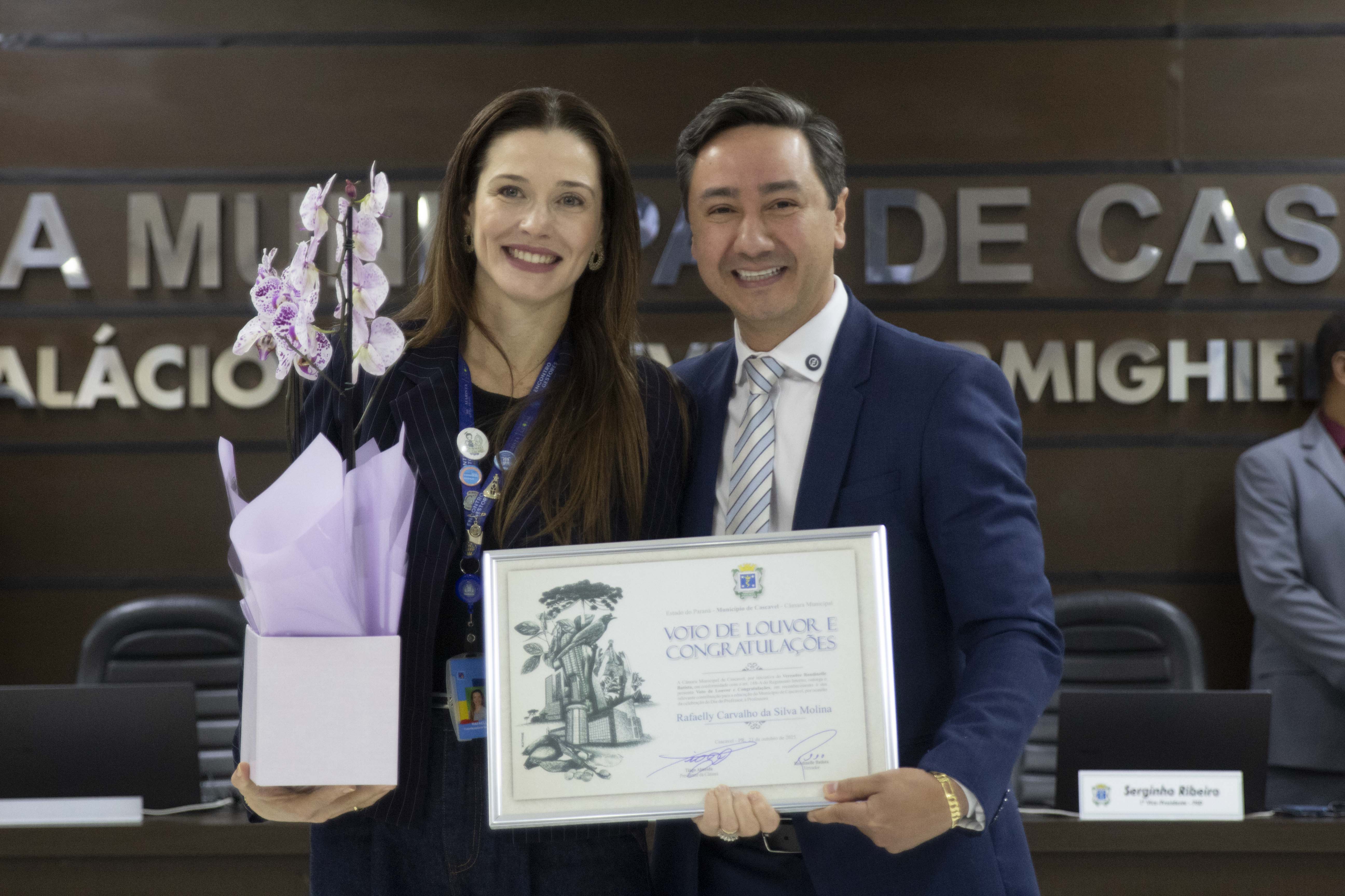 Por proposição do vereador Rondinelle Batista, a professora Rafaelly Carvalho da Silva Molina foi agraciada. Com mais de 25 anos dedicados à educação, Rafaelly é atualmente diretora-geral do Colégio Marista de Cascavel, onde lidera processos pedagógicos e administrativos com excelência e inovação.