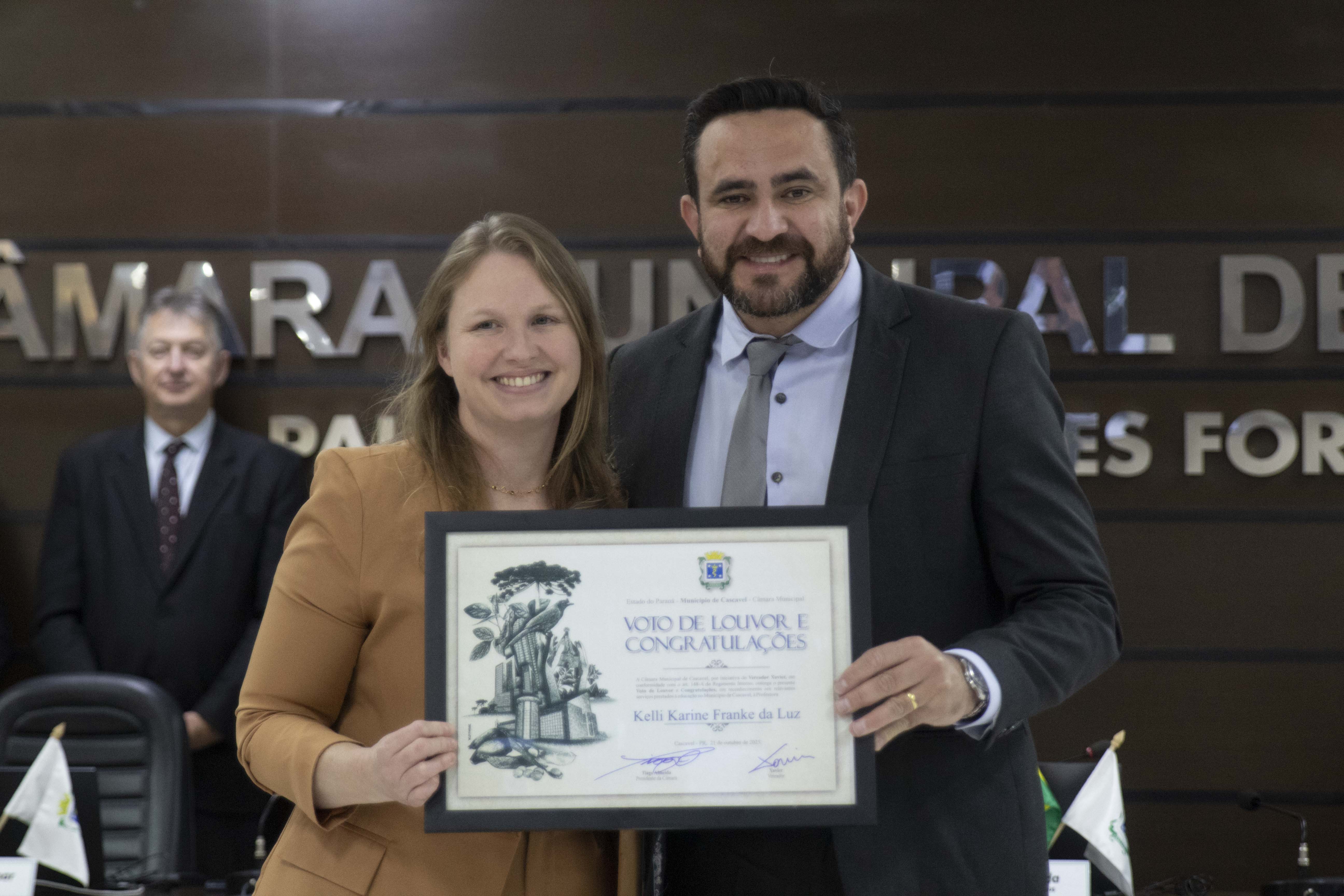 Já o vereador Everton Guimarães prestou homenagem à professora Rafaela Talita Eckstein Bergamo, idealizadora da Escola do Bosque Mananciais em Cascavel, reconhecida por criar um ambiente de aprendizado integral e humanizado, baseado na alegria de aprender e nos valores familiares.