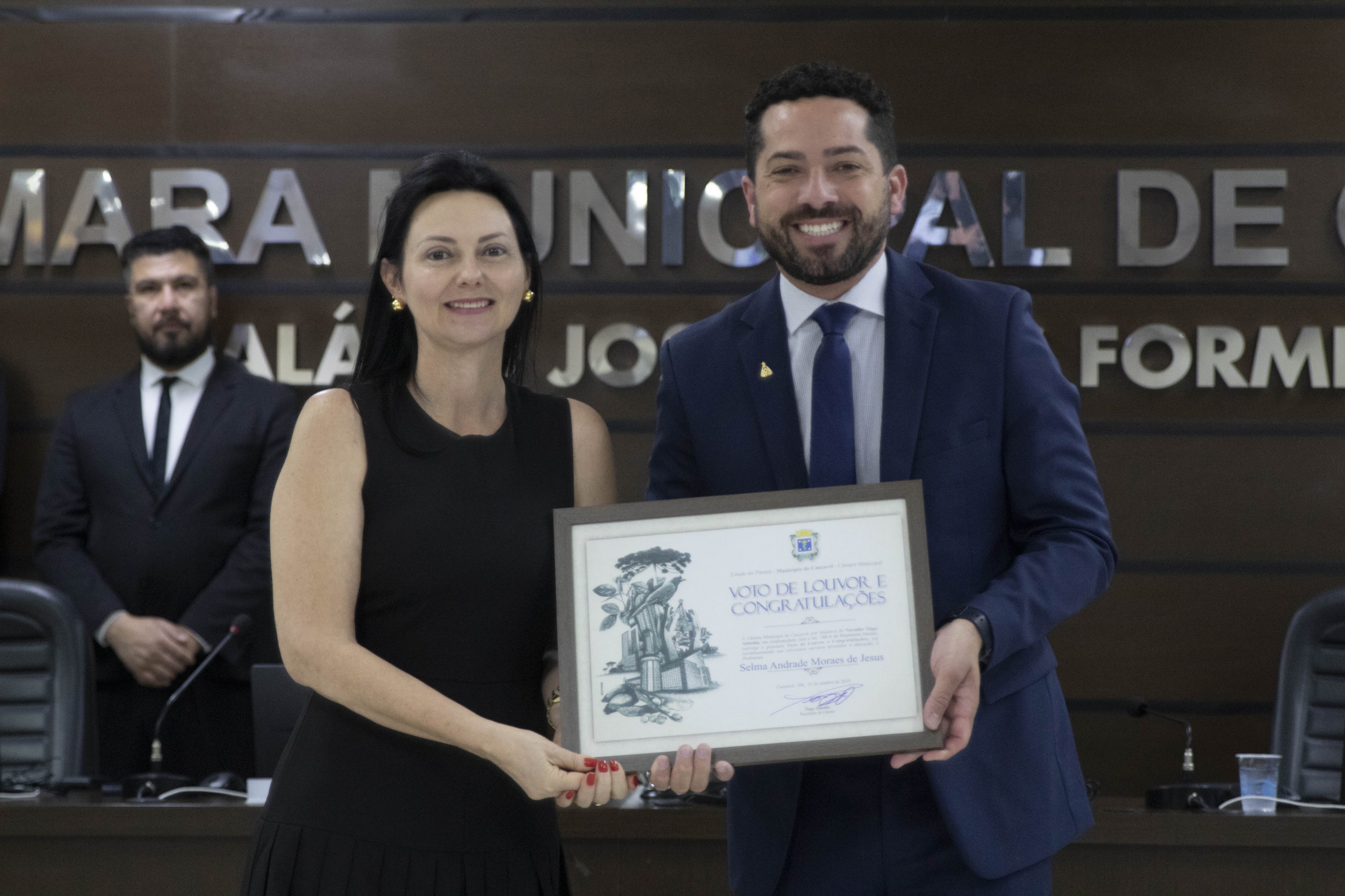 Por proposição do vereador Tiago Almeida, foi homenageada a professora Selma Andrade Moraes de Jesus, cuja trajetória une pedagogia e psicopedagogia, com atuação marcante no Colégio Estadual Jardim Interlagos, no SAREH e em instituições como o Colégio Estadual Olinda Truffa de Carvalho.