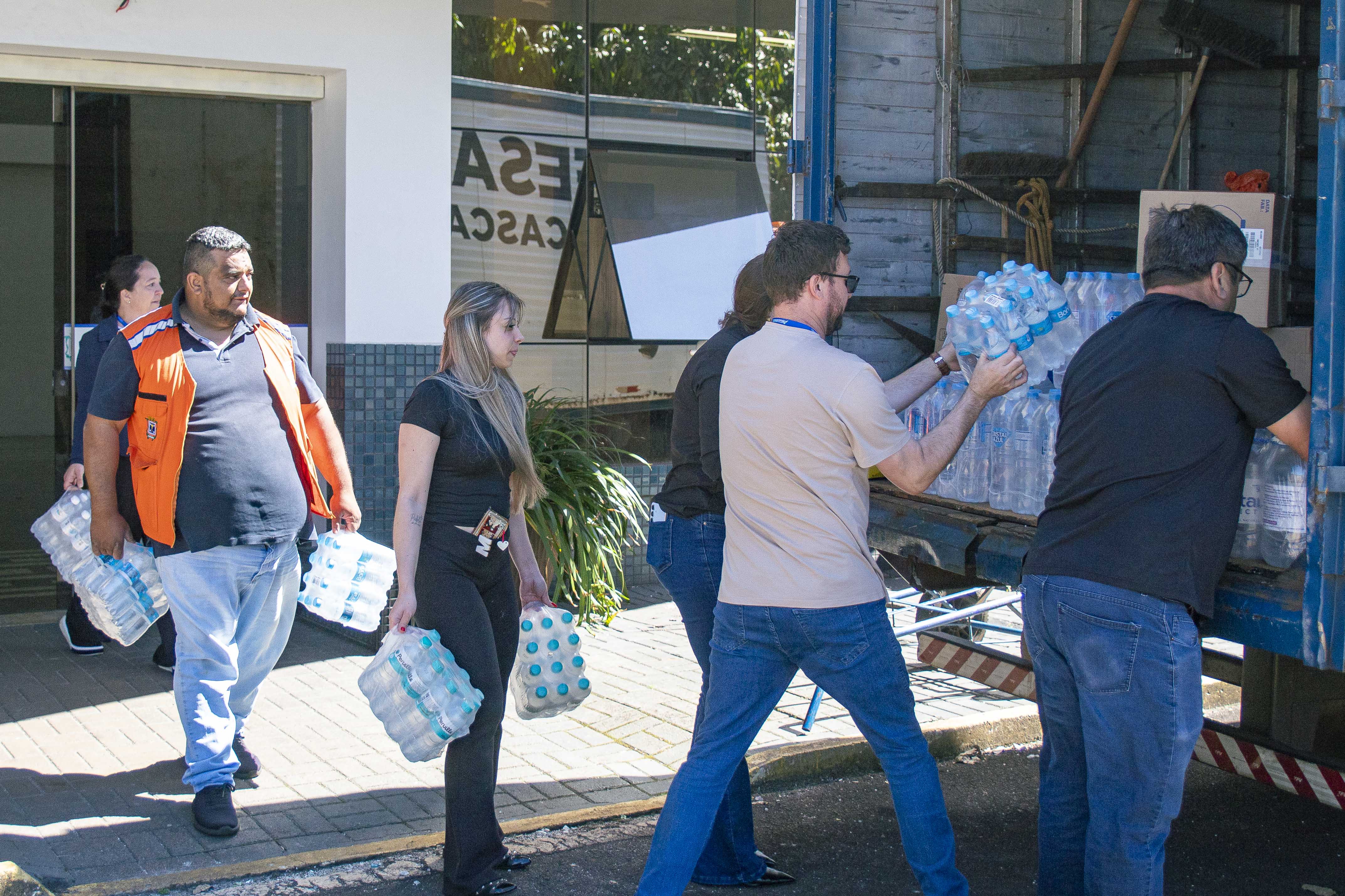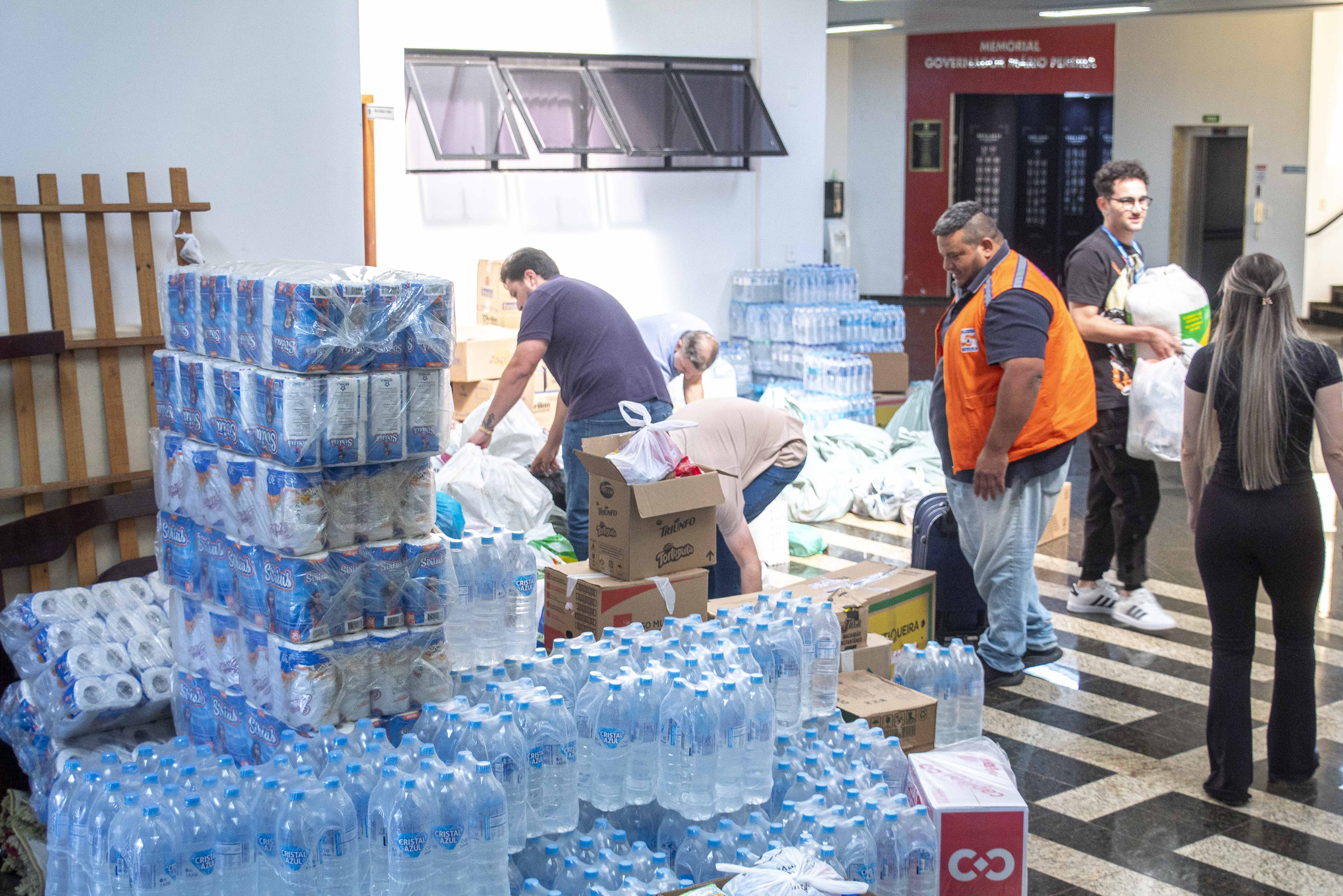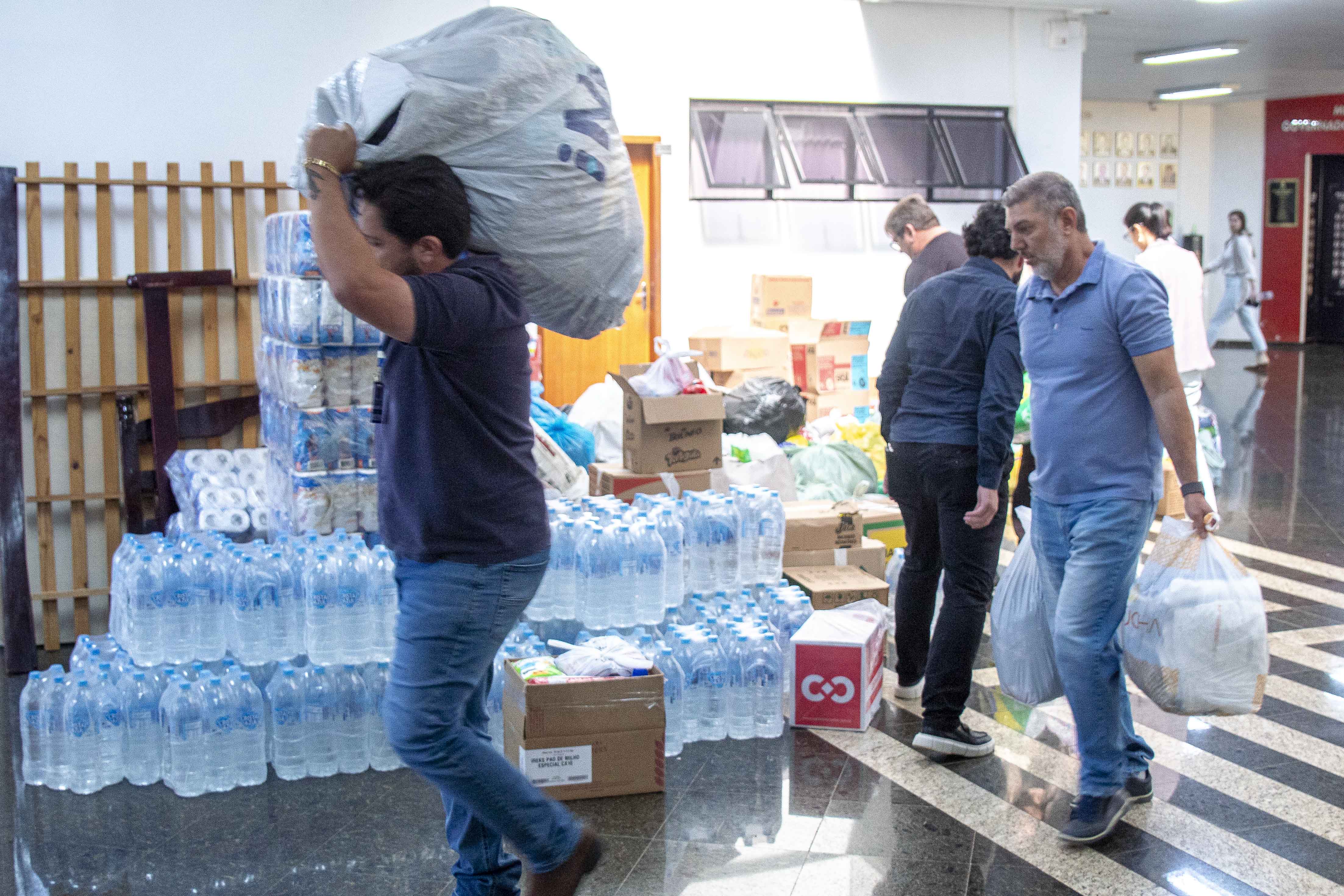 Entre os itens arrecadados, estão: roupas de adulto, idoso e criança, masculinas e femininas, itens para pets, roupa de cama, itens alimentícios e cestas básicas prontas, caixas fechadas com leite e pacotes com água mineral, papel higiênico, absorventes e até uma cama completa com colchão.