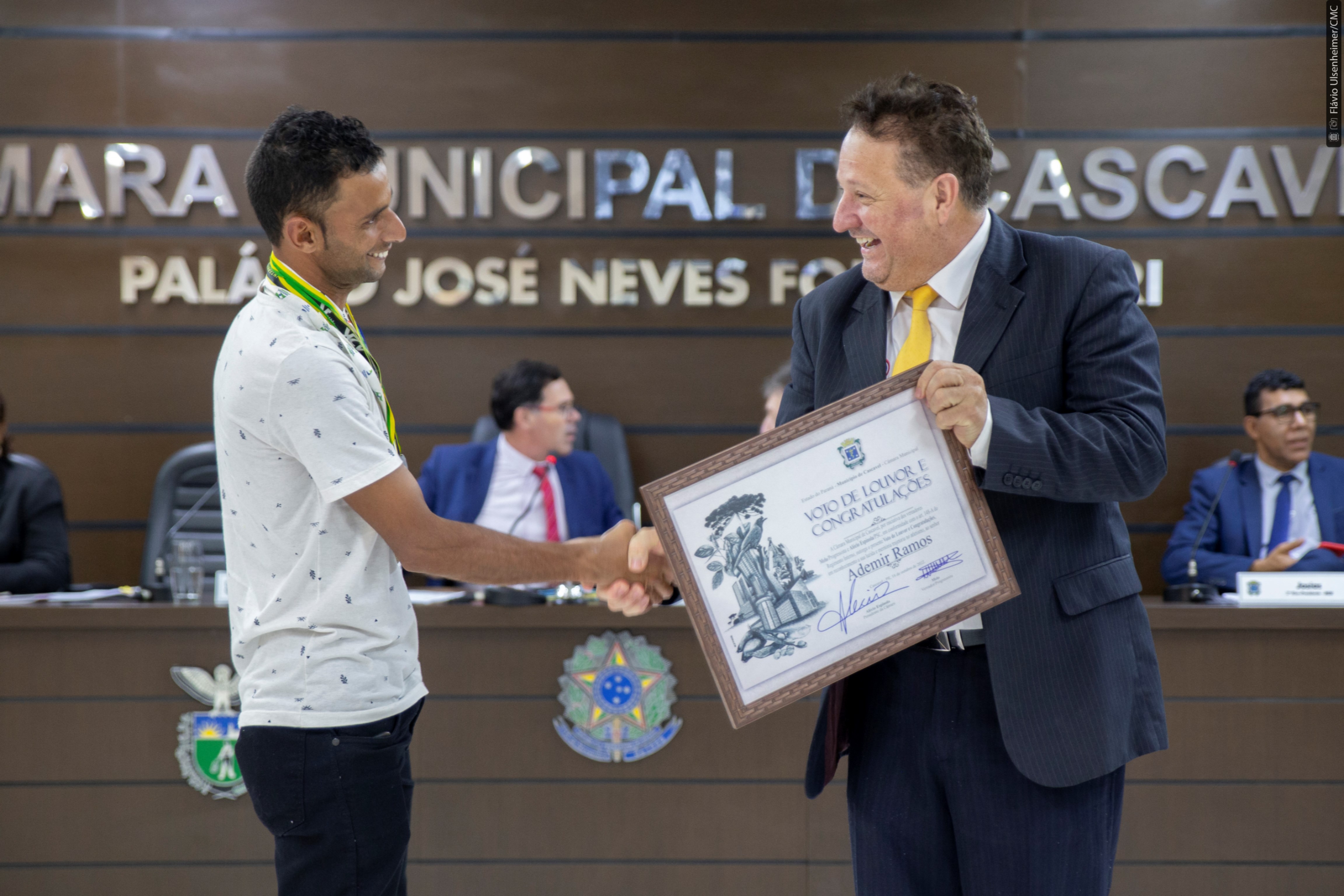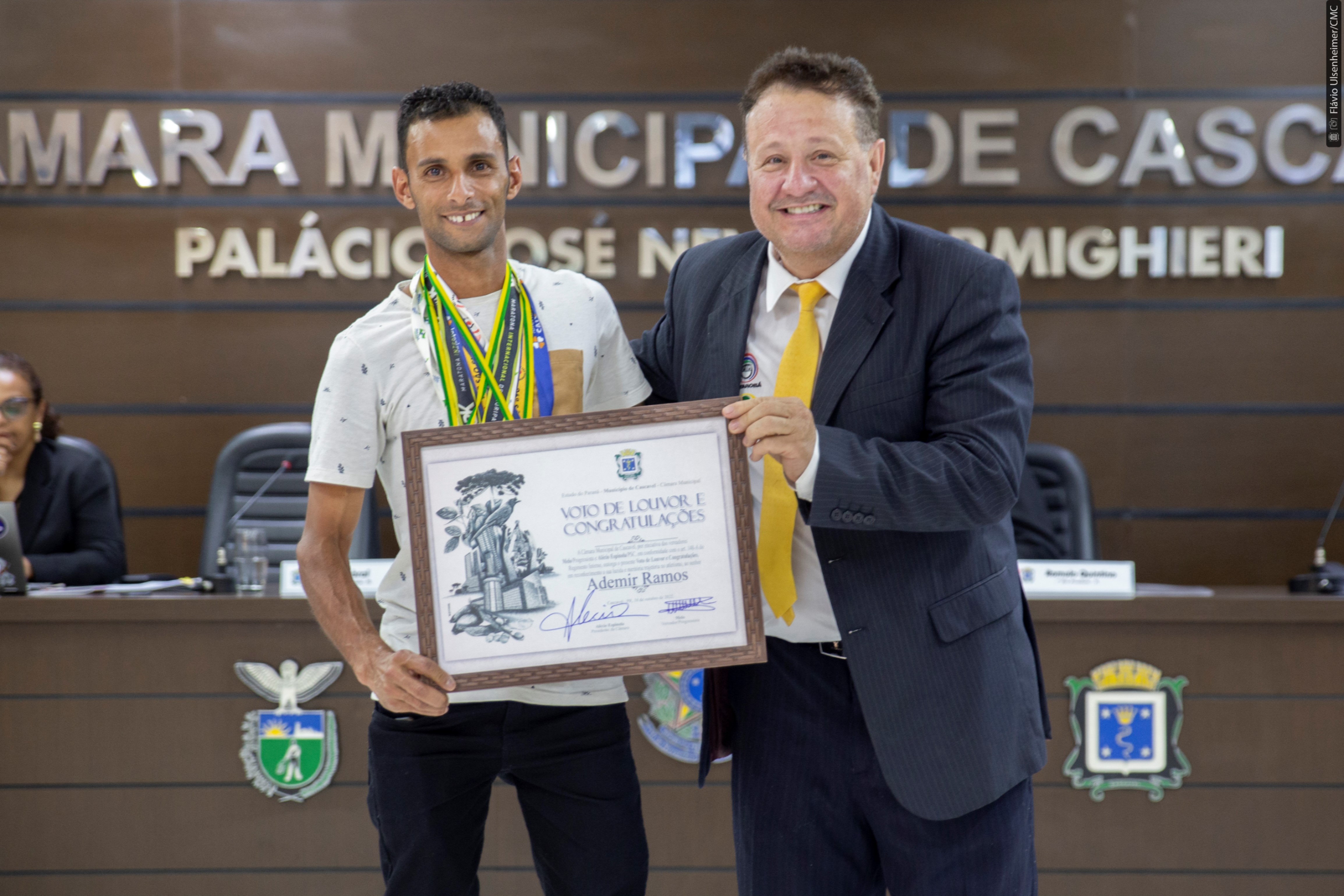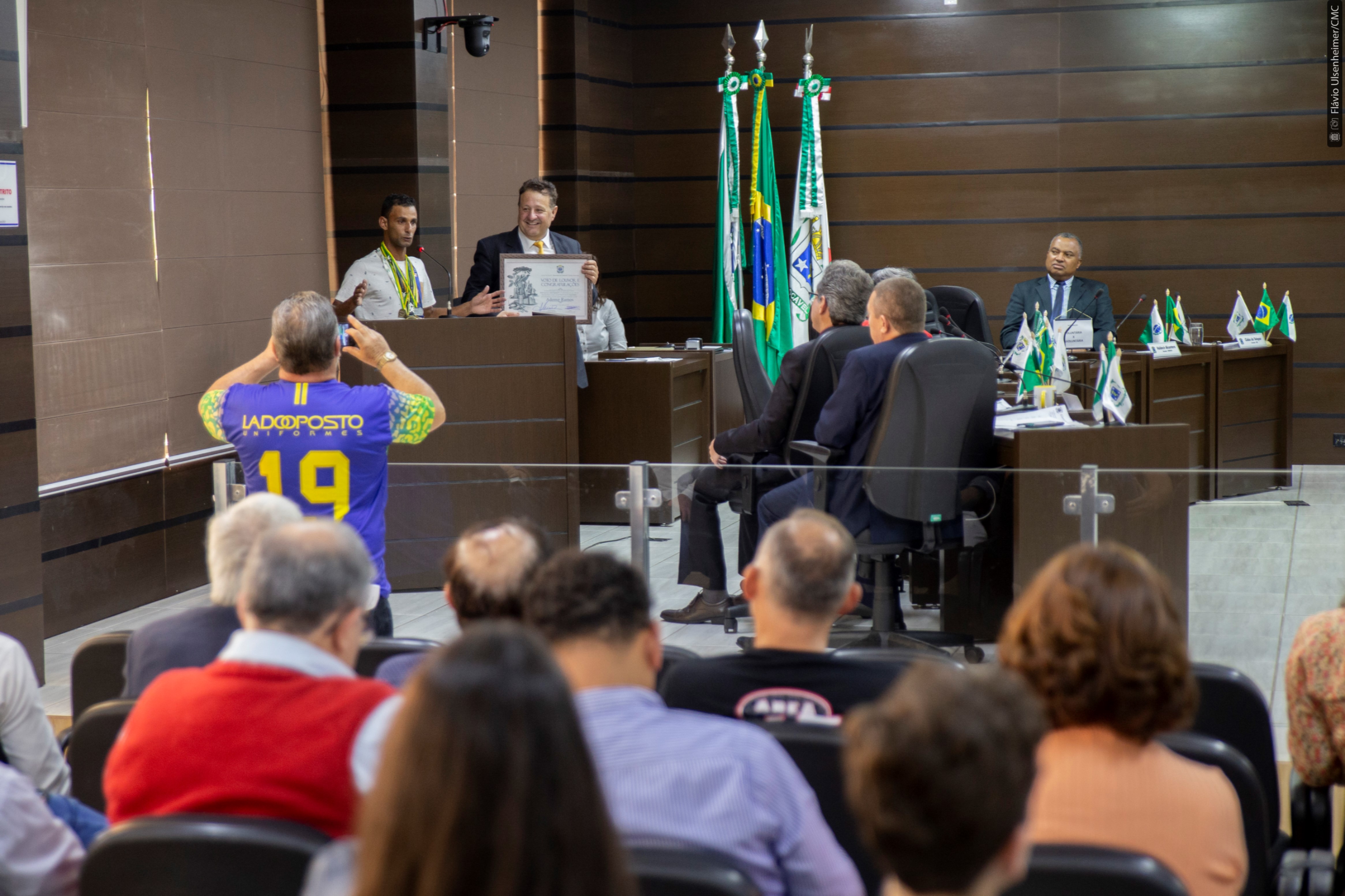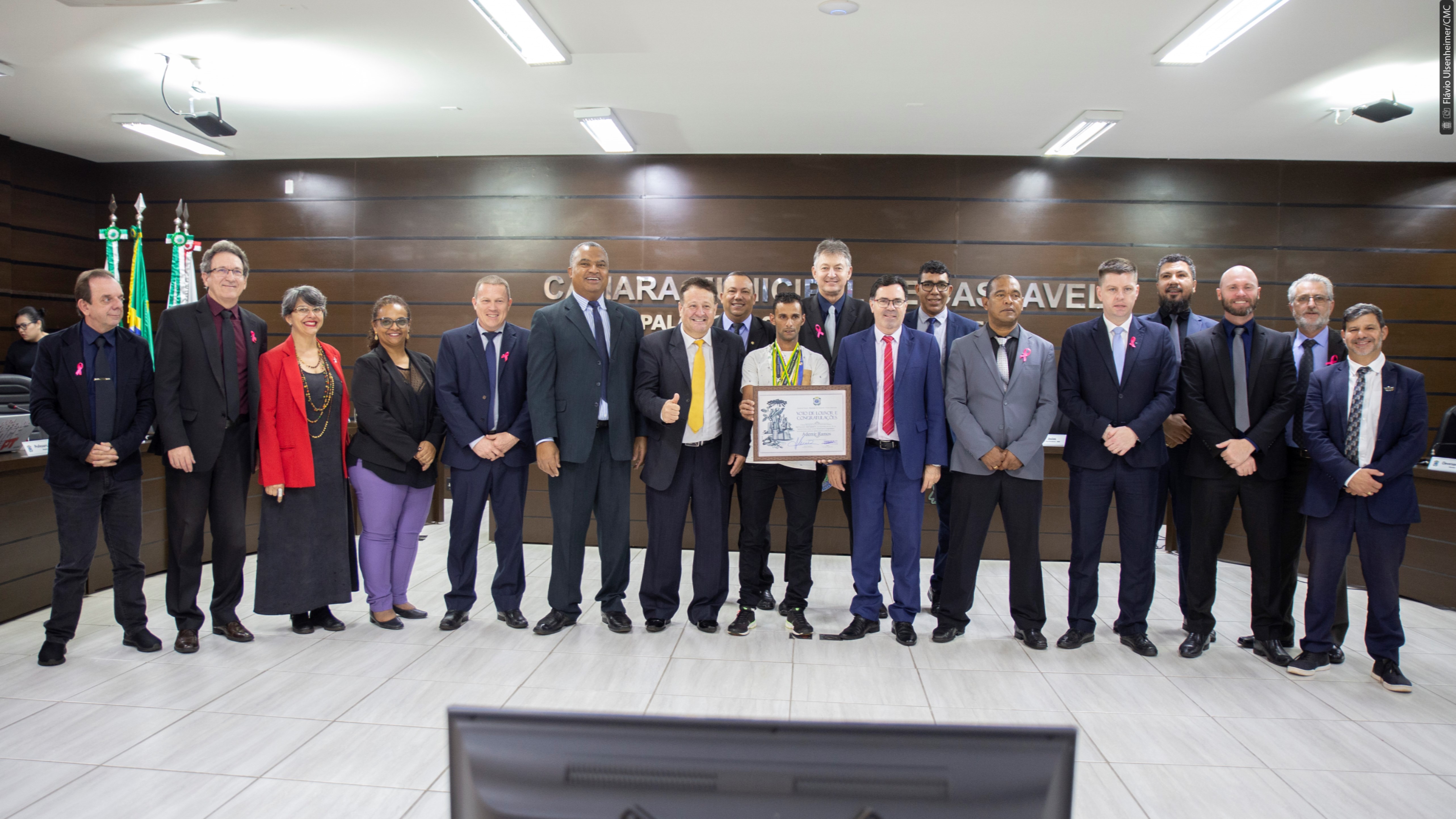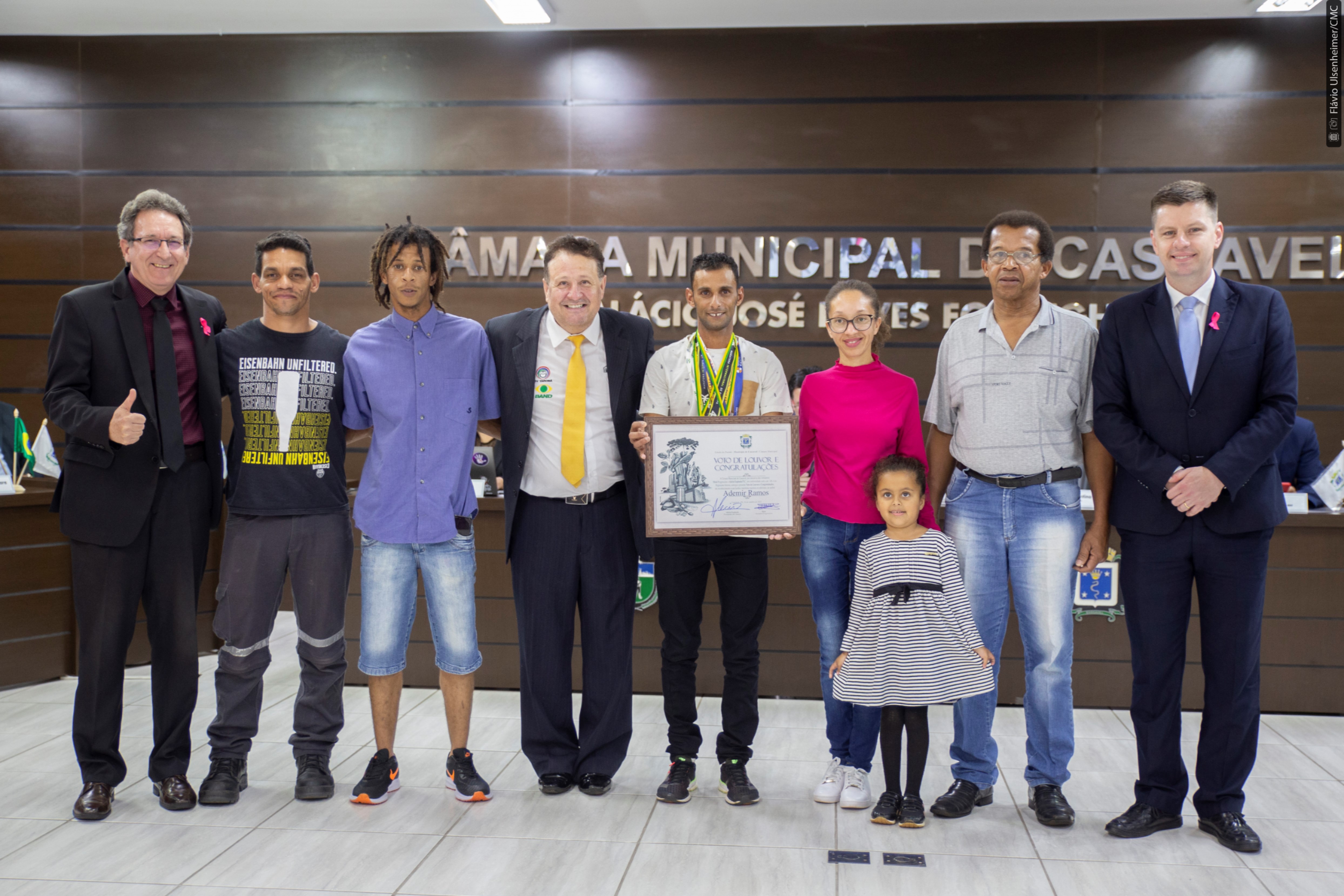 Melo, como primeiro autor do requerimento, disse que tem “a honra de homenagear uma pessoa que realmente representa Cascavel e que tem amor pelo esporte”. Bastante emocionado e aplaudido ao agradecer na tribuna a homenagem, Ademir também destacou que nas corridas leva não apenas o nome dos seus patrocinadores, mas se sente representando toda a cidade onde nasceu e mora no bairro Brasília. “Onde eu chego, o pessoal fala: ‘o gari de Cascavel tá aqui’, e isso pra mim é uma alegria, poder chegar numa cidade e ser reconhecido assim”, disse ele.