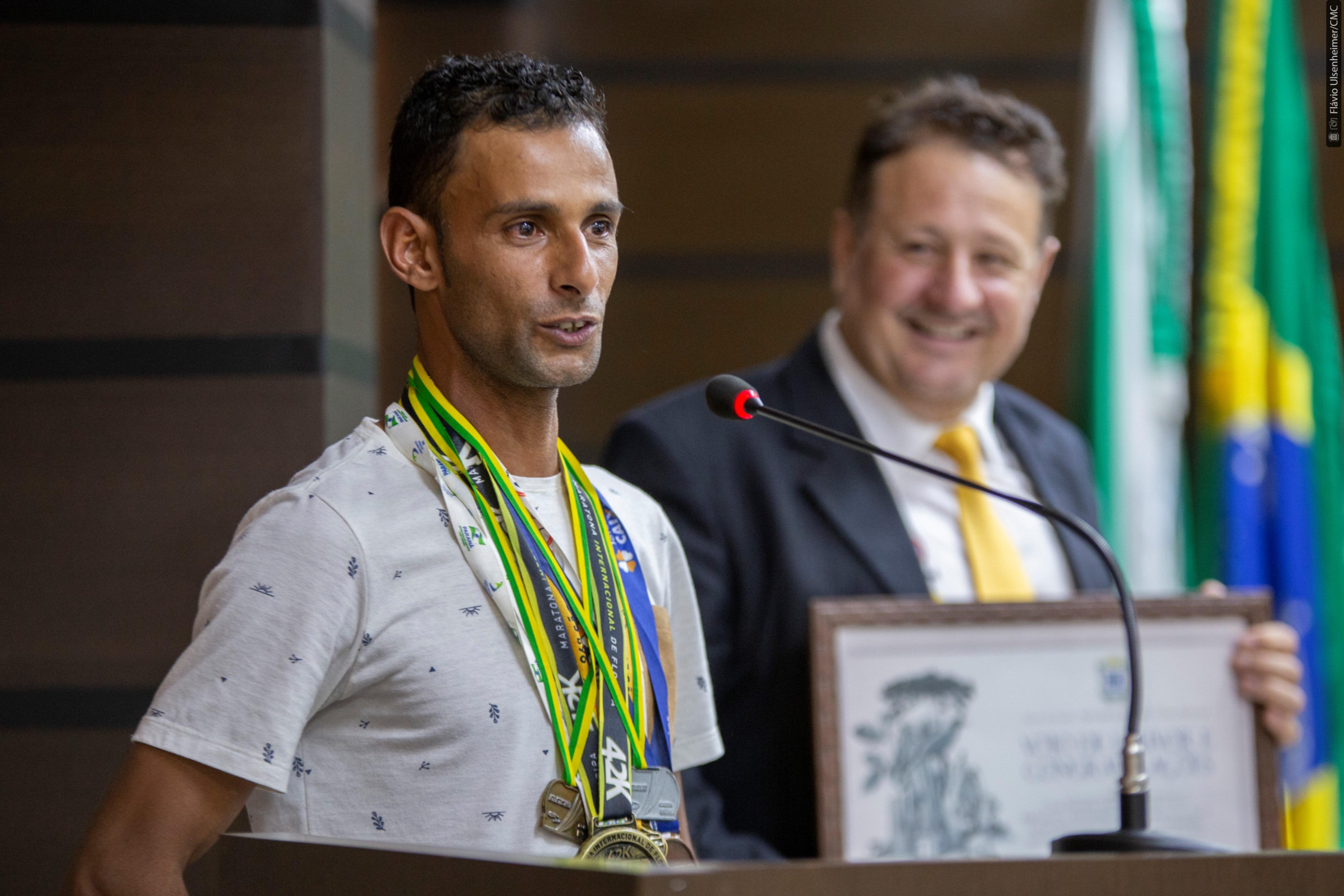 A Câmara Municipal recebeu, nesta terça-feira (18), o maratonista Ademir Ramos para lhe fazer a entrega do Voto de Louvor e Congratulações em reconhecimento à sua trajetória no atletismo. A homenagem foi proposta pelos vereadores Melo (Progressistas) e Alécio Espínola (PSC) por meio do Requerimento nº 235/2022.