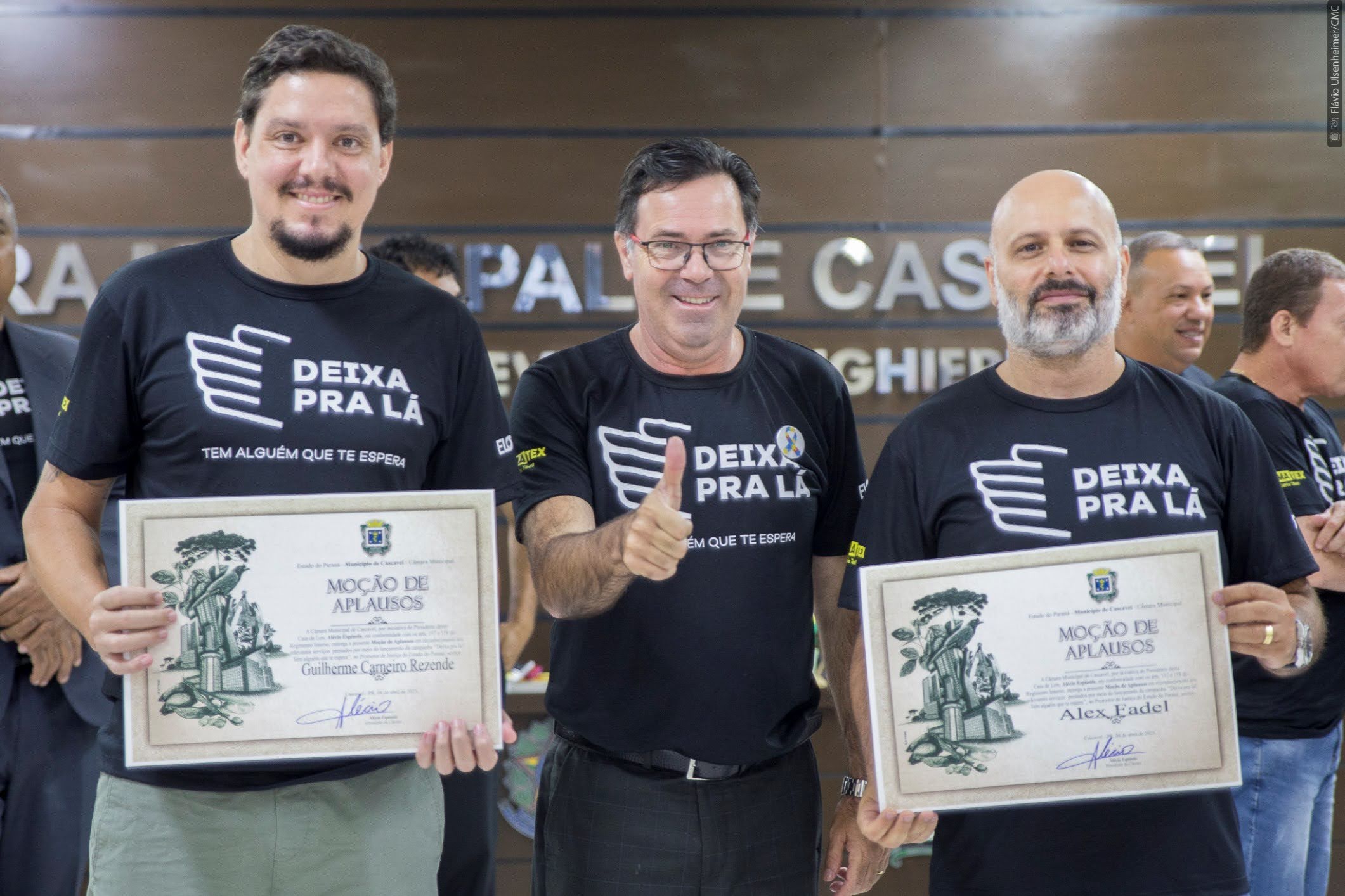 Uma Moção de Aplauso de autoria do vereador Alécio Espínola (PSC) foi aprovada e já entregue na sessão desta terça-feira (04) aos homenageados, a 5ª e a 16ª Promotorias do Ministério Público do Paraná, pelo lançamento da campanha “Deixa pra lá! Tem alguém que te espera”. A entrega foi feita aos promotores de Justiça Alex Fadel e Guilherme Carneiro de Rezende.