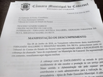 Os parlamentares Fernando Hallberg (PPL) e Policial Madril (PMB) protocolaram nesta quarta-feira (08) uma manifestação de descumprimento de recomendação do Tribunal de Contas com relação a taxa de expediente por parte da prefeitura pedindo que ela seja ef