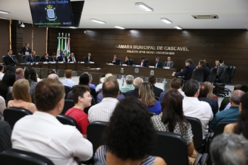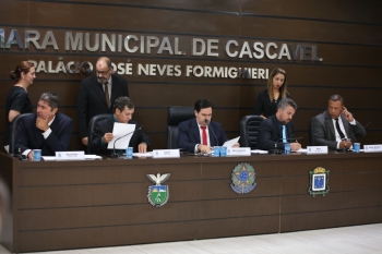 Ne ste dia 04 de fevereiro a Câmara de Cascavel retomou suas atividades após o recesso parlamentar e realizou a primeira sessão do ano já com a nova Mesa Diretora da Casa. A posse dos vereadores Alécio Espínola/PSC, presidente, Roberto Parra/MDB, 1º vice-