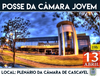 A Câmara de Cascavel promove a sessão solene de posse da Câmara Jovem para o biênio 2017/2018 nesta quinta-feira, 13 de abril, às 19h, no plenário da Câmara. Além do presidente da Casa, Gugu Bueno (PR), que conduzirá a cerimônia, estarão presentes vereado