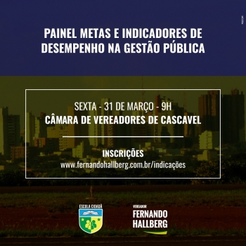 Nesta sexta-feira (31) às 9 horas acontece no Plenário da Câmara Municipal de Cascavel o Painel – Metas e Indicadores de Desempenho na Gestão. O painel esta sendo realizado pelo Vereador Fernando Hallberg (PPL) e contará com a presença de especialistas no