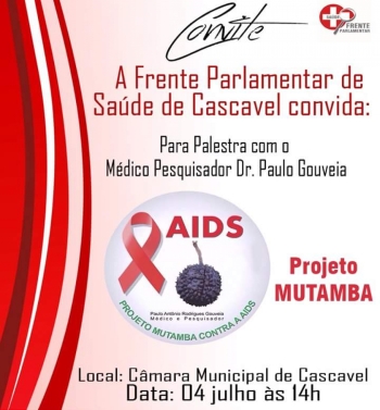 A Frente Parlamentar de Saúde de Câmara de Cascavel convida os interessados para uma palestra nesta segunda-feira (4) com início às 14 horas com o médico e pesquisador Paulo Gouveia, que comanda as pesquisas em torno do Projeto Mutamba Contra a Aids. A Mu