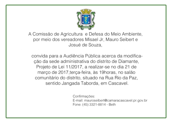 Nesta terça-feira (21) a Comissão de Agricultura e Defesa do Meio Ambiente da Câmara promove uma audiência na comunidade de Diamante, no interior do município, às 19h, no salão comunitário.