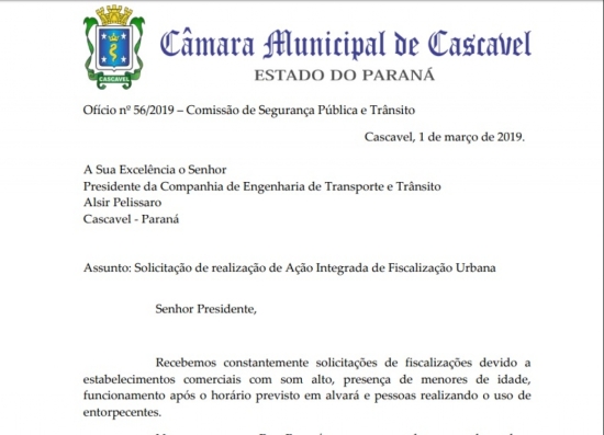 A Comissão de Segurança e Trânsito da Câmara recebeu nesta semana um abaixo-assinado dos moradores da região da Rua Paraná, com diversos apontamentos e solicitação de providências. Ao todo, foram coletadas mais de 300 assinaturas de pessoas que residem em edifícios nesta região.