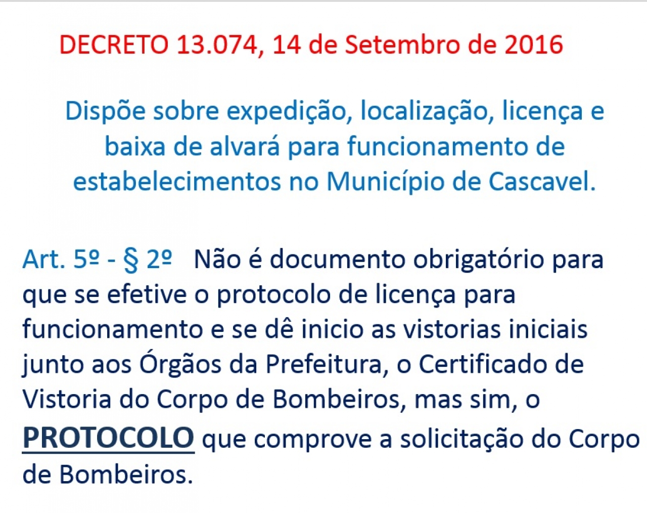 De acordo com o artigo 5º, parágrafo segundo, “não é documento obrigatório para que se efetive o protocolo de licença para funcionamento e se dê início às vistorias iniciais junto aos órgãos da Prefeitura, o Certificado de Vistoria do Corpo de Bombeiros, mas sim o protocolo que comprove a solicitação ao Corpo de Bombeiros”.