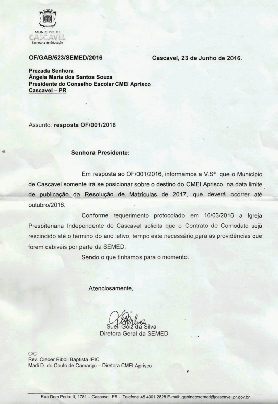 Desde maio, a comunidade escolar do CMEI aguardava uma resposta a um ofício que solicitava informações sobre o destino da unidade. O retorno veio por meio de um documento assinado pela diretora geral da Secretaria, Sueli Góiz da Silva, apresentando que a SEMED só dará um encaminhamento sobre o destino do CMEI em outubro, ou seja, dois meses antes do prazo que a unidade deve deixar o espaço cedido.