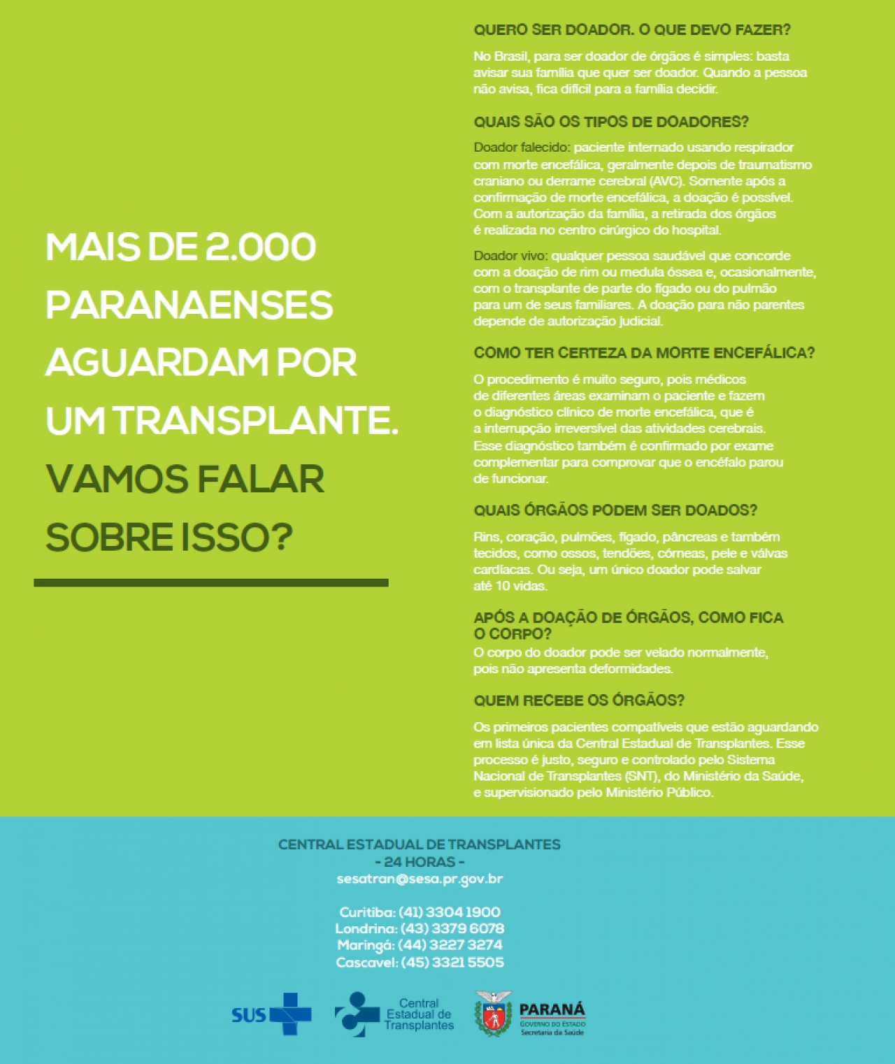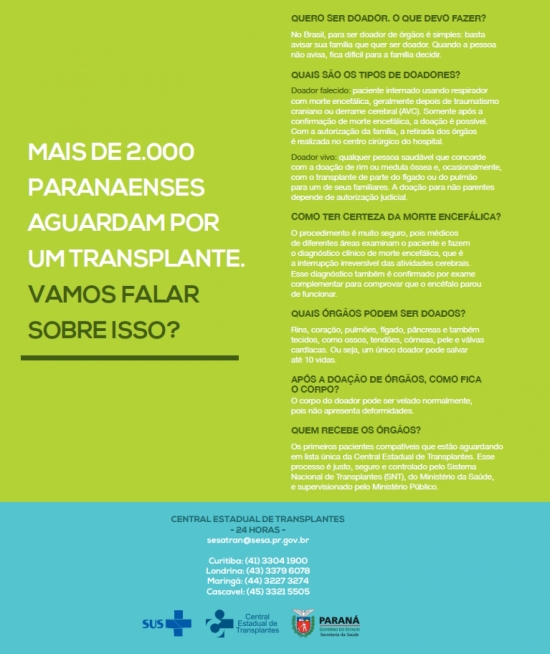“Doação de Órgãos: Fale sobre isso”, esse é o nome da campanha da Secretaria de Estado de Saúde. O assunto ainda é tido como tabu e precisar ser mais bem explorado pela sociedade civil e também pelos poderes públicos.