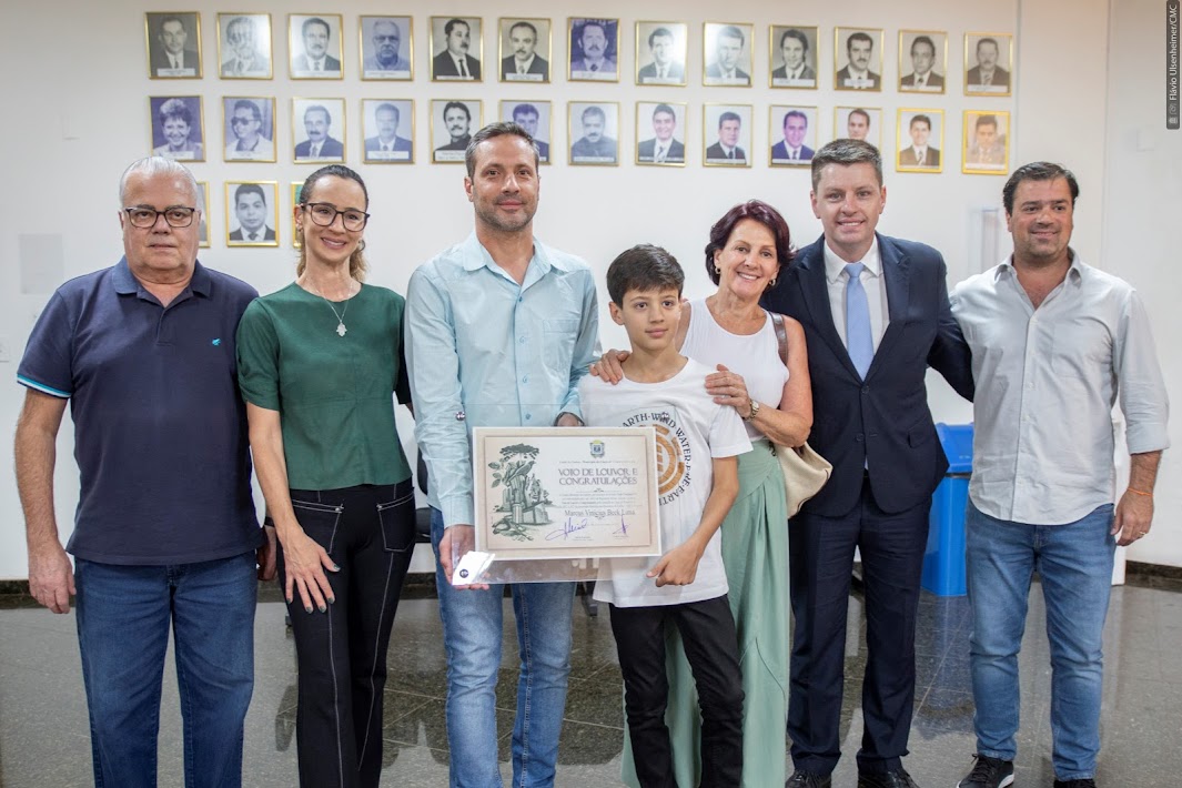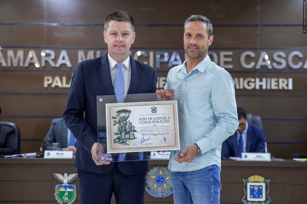 A Câmara fez a entrega nesta quinta-feira (17) do Voto de Louvor e Congratulações a Marcus Vinicius Beck Lima pela sua condução ao cargo de Presidente na Gestão 2022 a 2023 da Associação Brasileira dos Executivos de Futebol - ABEX. O requerimento é de autoria do vereador e líder de governo, Pedro Sampaio (PSC).