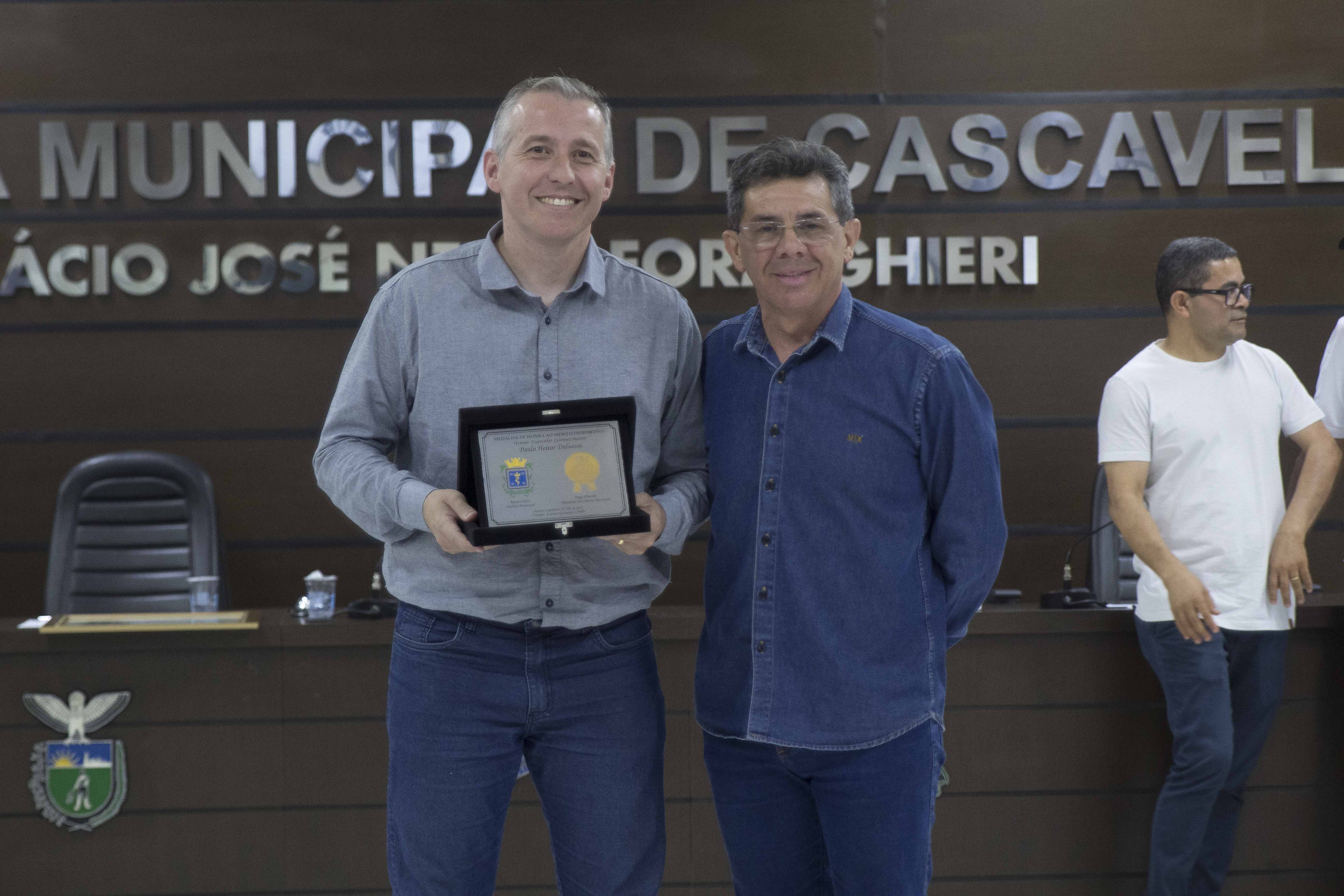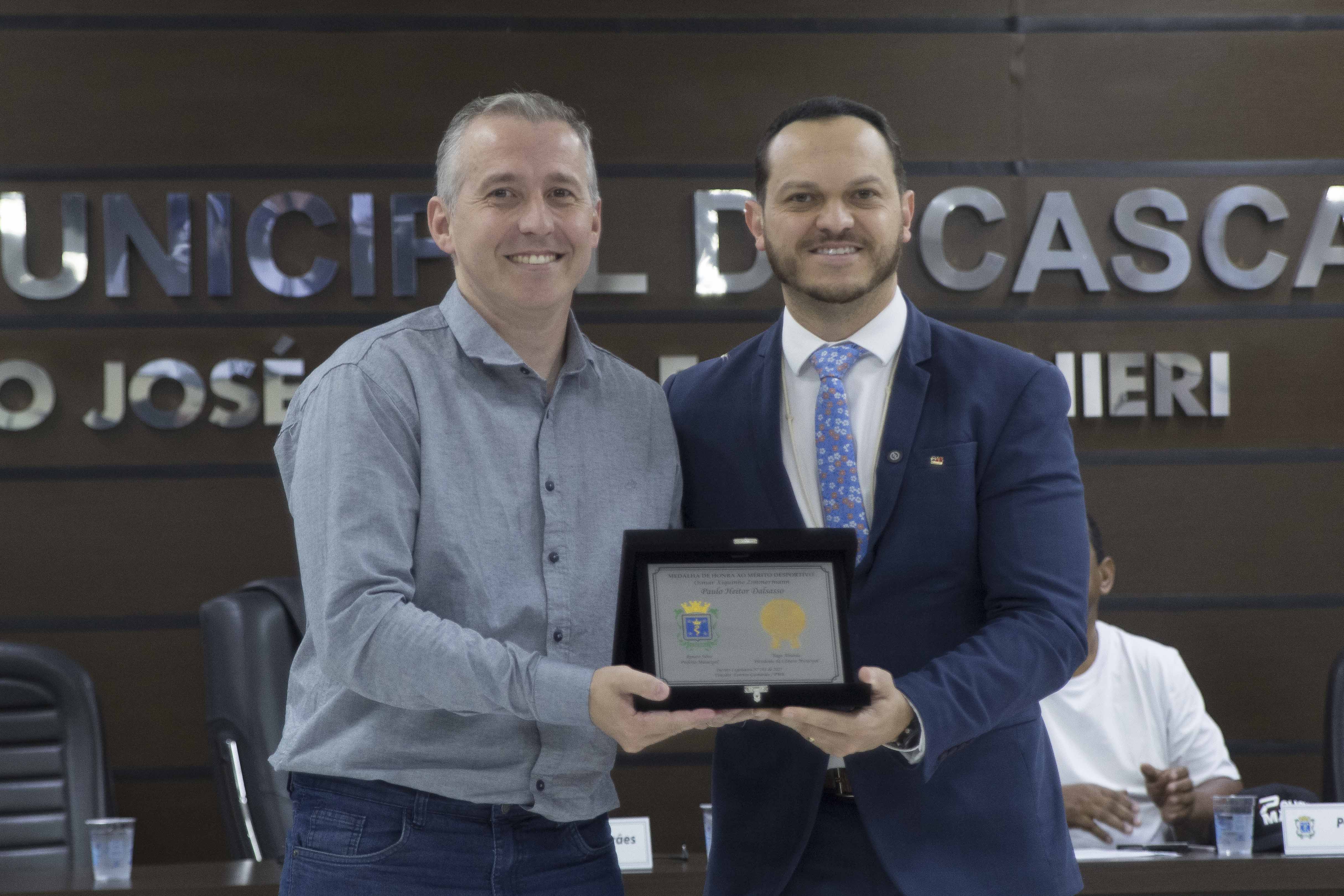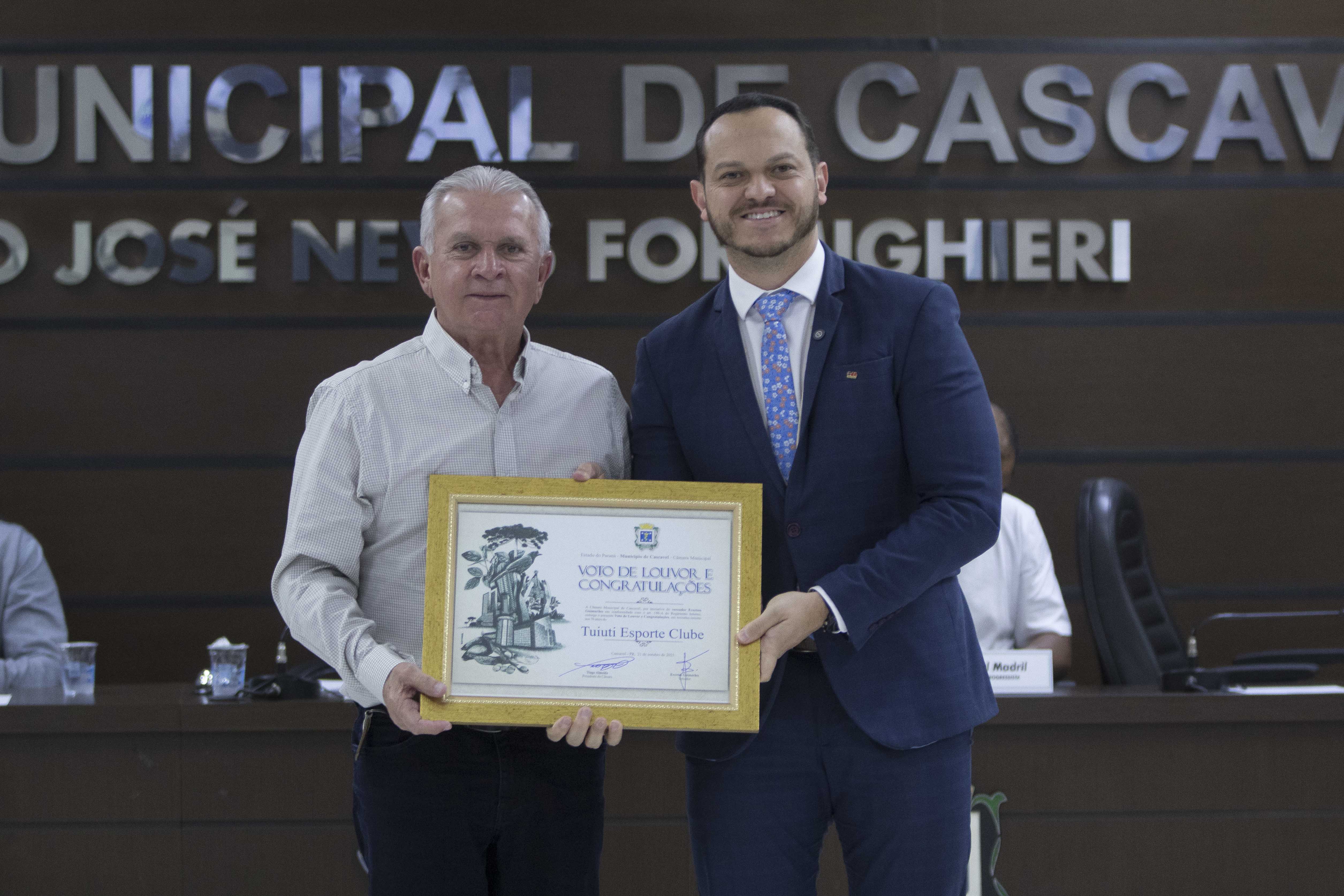 Em sessão solene na noite de terça-feira (21), a Câmara Municipal fez a entrega de um Voto de Louvor e Congratulações ao Clube Tuiuti e da Medalha do Mérito Esportivo “Osmar Xiquinho Zimmermann” ao técnico Paulo Dalsasso. O autor das duas homenagens é o vereador Everton Guimarães (PMB).