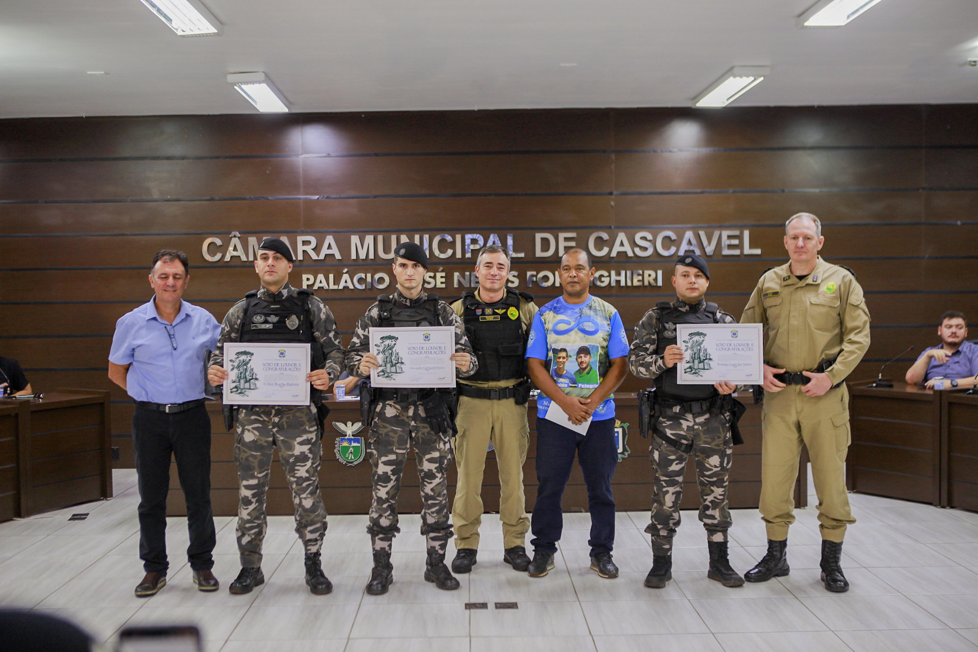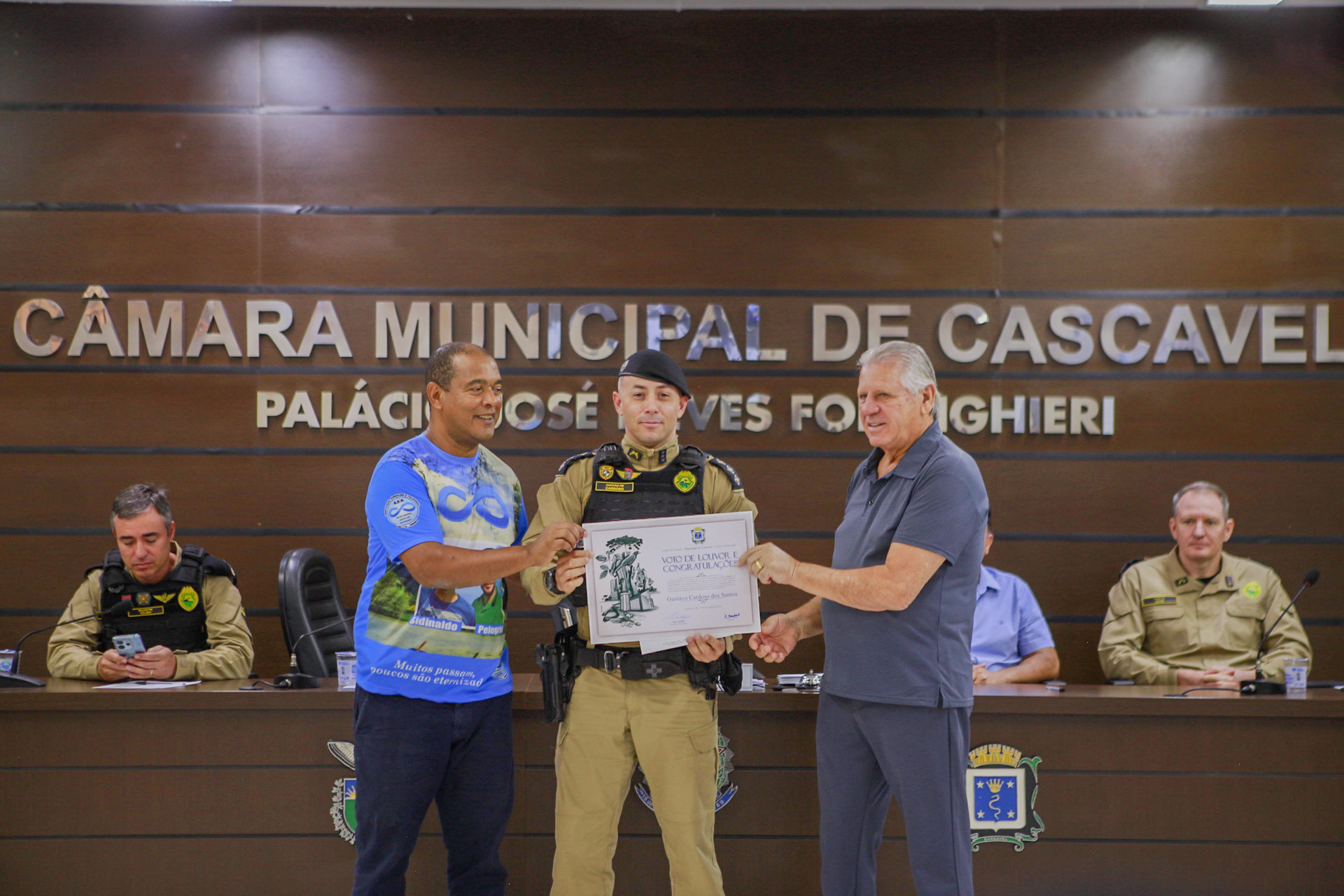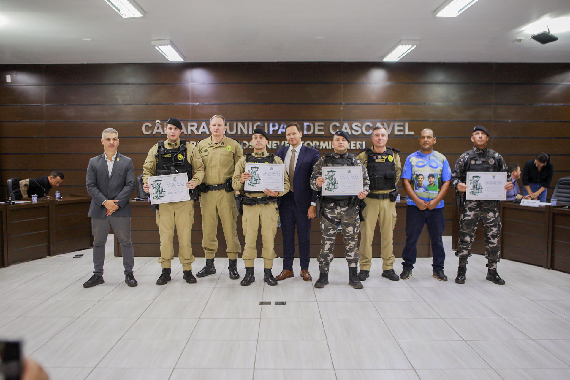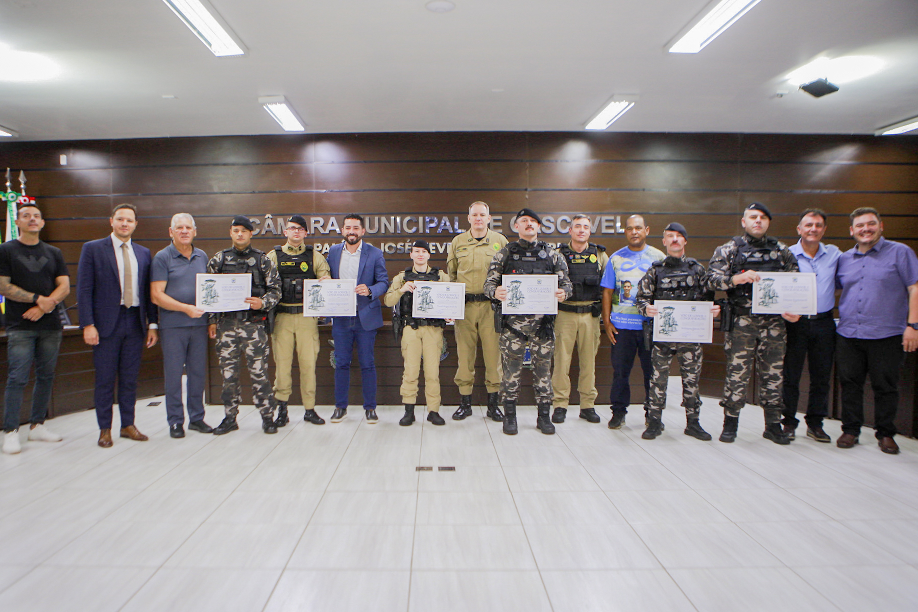 Na sequência, foram entregues Votos de Louvor e Congratulações a vários policiais militares com atuação em Cascavel, como reconhecimento ao destaque em ações de combate ao crime. No total, foram homenageados os seguintes PMs: