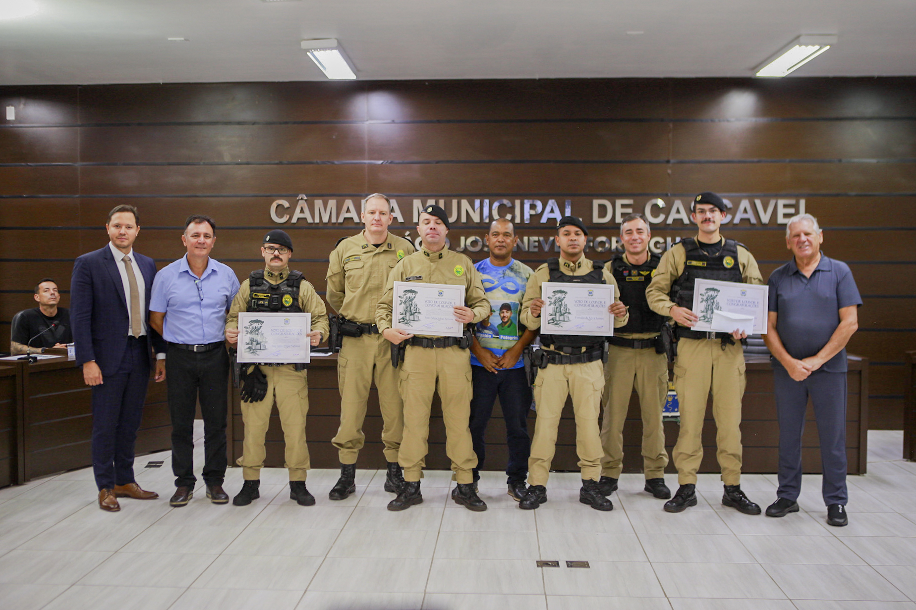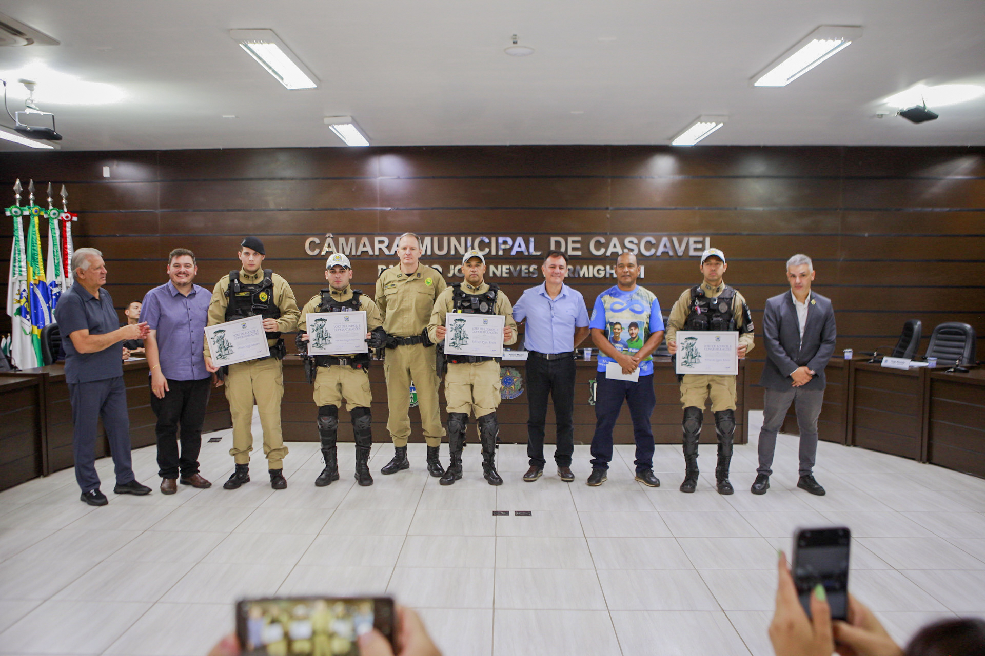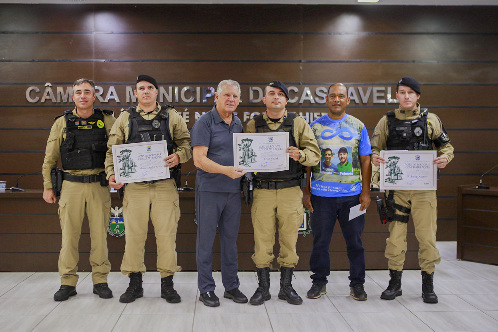 Na sequência, foram entregues Votos de Louvor e Congratulações a vários policiais militares com atuação em Cascavel, como reconhecimento ao destaque em ações de combate ao crime. No total, foram homenageados os seguintes PMs: