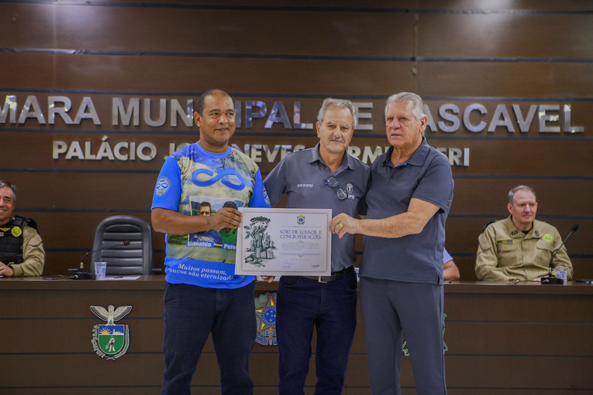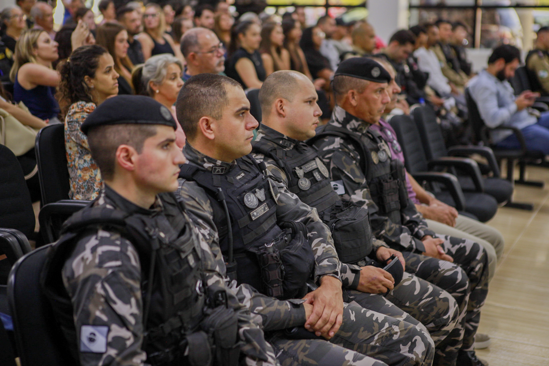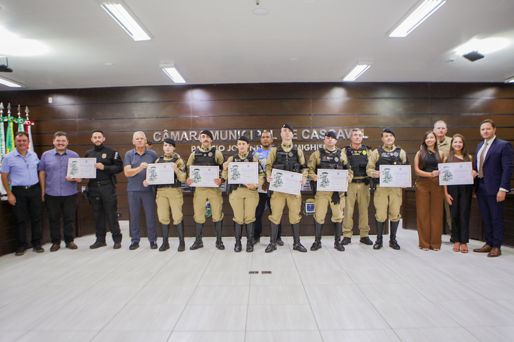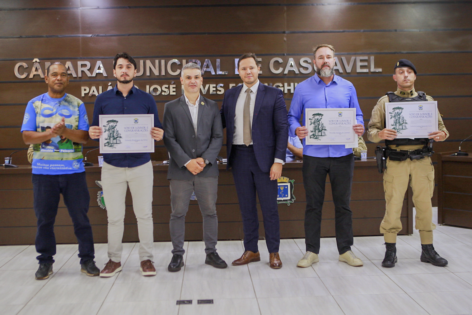 Na sequência, foram entregues Votos de Louvor e Congratulações a vários policiais militares com atuação em Cascavel, como reconhecimento ao destaque em ações de combate ao crime. No total, foram homenageados os seguintes PMs: