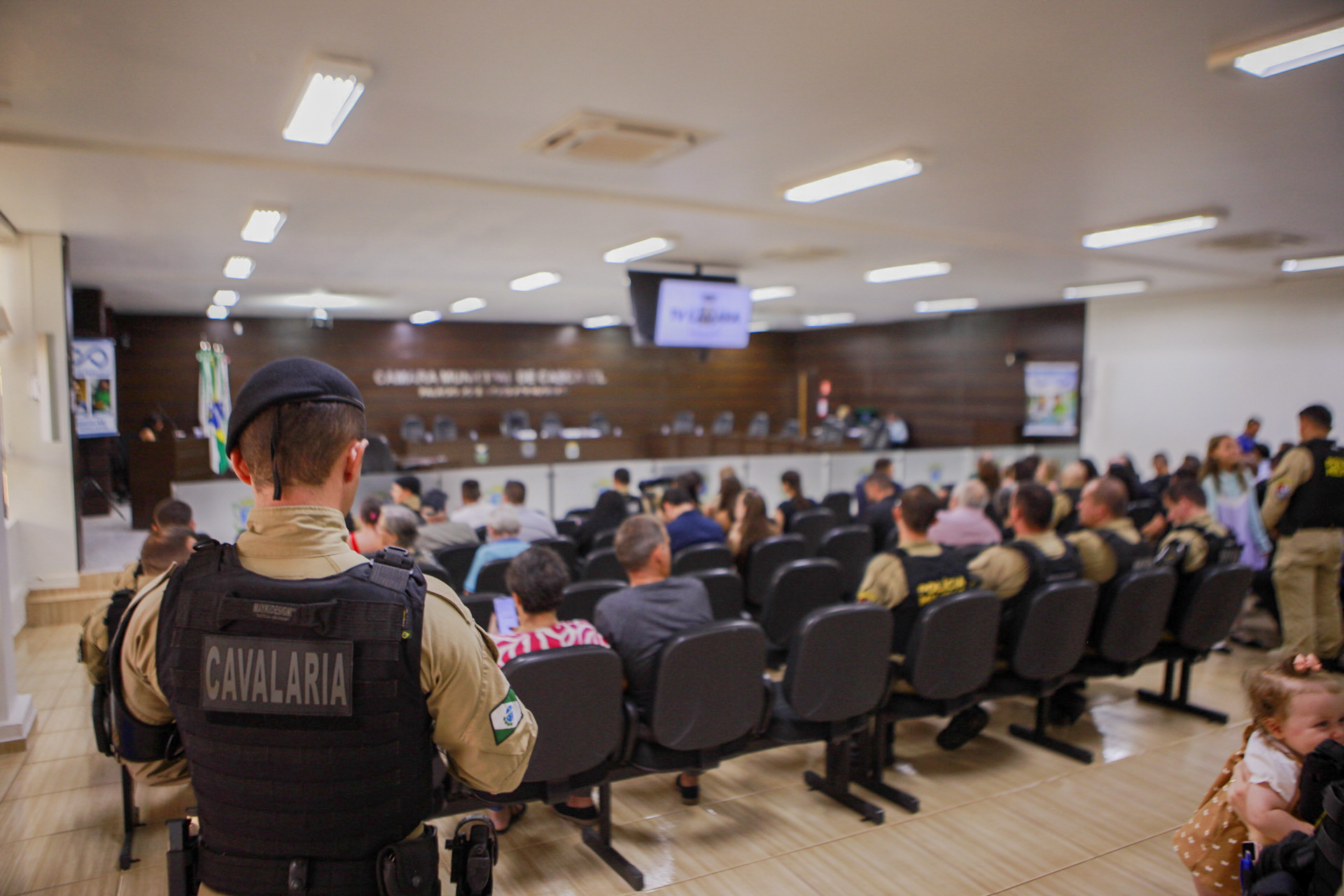 A manhã da sexta-feira (27) na Câmara Municipal foi marcada por uma sessão solene com o Plenário lotado. Por iniciativa do vereador Policial Madril (PP), foram entregues Votos de Louvor e Congratulações contidos em 15 requerimentos e dirigidos a dezenas de integrantes da Polícia Militar, além da Associação da Família Policial (AFPOL).