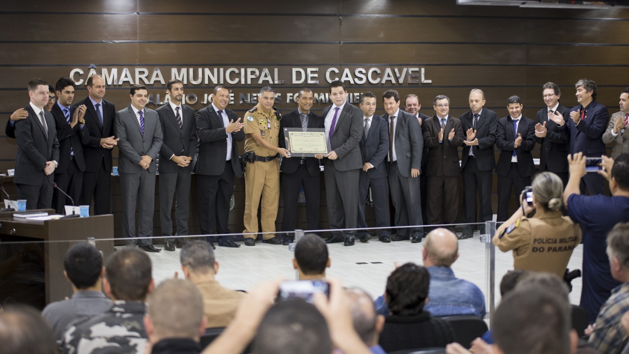 A Câmara entregou nesta segunda-feira (08) dois requerimentos de votos de louvor e congratulações a policiais da PM cascavelense. No Requerimento 32/2017, o vereador Madril (PMB) homenageou os policiais militares Marcos Roberto Capelesso, Anderson Avelino Pelegrini, Milton Junio dos Santos Almeida, Rafael Ribeiro Alves, Fabiano Acosta Betim, Dirceu Eichstaedt, Brian Vacari, Jean Roberto Capistrano Ferreira e Maicon Miguel da Silva, por estarem entre os 30 policiais que mais prisões e apreensões realizaram no Paraná no ano de 2016.