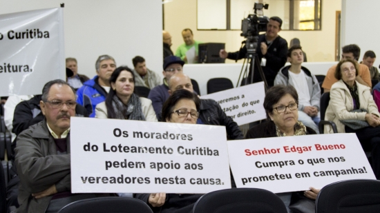 Procurados pelas famílias do loteamento Curitiba, os vereadores decidiram buscar esclarecimentos sobre a questão jurídica envolvendo o caso e também declarar publicamente solidariedade aos moradores. Na sessão desta terça-feira (28), foi aprovada a Moção nº 06/2016, que expressa apoio e solidariedade aos moradores do Loteamento Curitiba e na próxima segunda-feira, 04 de julho, às 14h, uma reunião será realizada com o Secretário Municipal de Assuntos Jurídicos, Rodrigo Tesser.