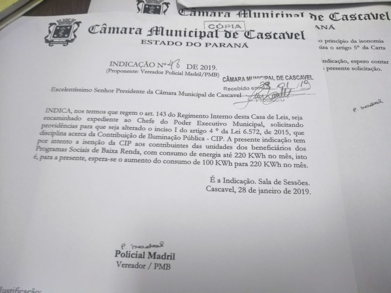 O vereador Policial Madril (PMB) está encaminhando ao prefeito Leonaldo Paranhos a Indicação 48/2019, pedindo que a prefeitura altere a Lei Municipal 6.572/2015, que trata do lançamento e cobrança da contribuição para custeio da iluminação pública e isenções da taxa de Contribuição de Iluminação Pública – CIP. Pela lei em vigor, são isentos os contribuintes das unidades com consumo de até 100 KWh.