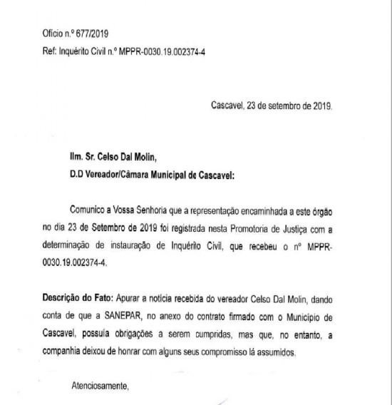 O Ministério Público confirmou no último dia 23 a determinação de instaurar inquérito civil acerca do contrato firmado entre município e Sanepar, válido de 2004 a 2024. O vereador Celso Dal Molin (PL) entregou ao promotor Ângelo Mazzuchi Santana Ferreira há duas semanas a documentação levantada nos últimos oito meses.