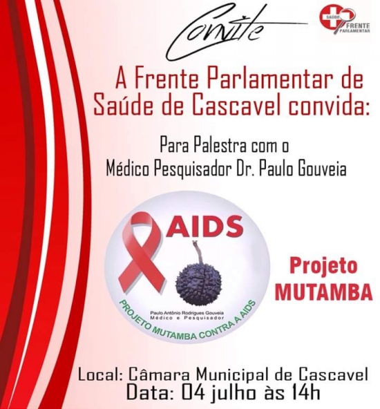 A Frente Parlamentar de Saúde de Câmara de Cascavel convida os interessados para uma palestra nesta segunda-feira (4) com início às 14 horas com o médico e pesquisador Paulo Gouveia, que comanda as pesquisas em torno do Projeto Mutamba Contra a Aids. A Mutamba é uma planta existente no cerrado dos estados de Goiás e Tocantins, que vem sendo apontada como capaz de curar a Síndrome de Imunodeficiência Adquirida.