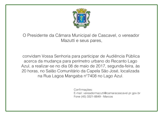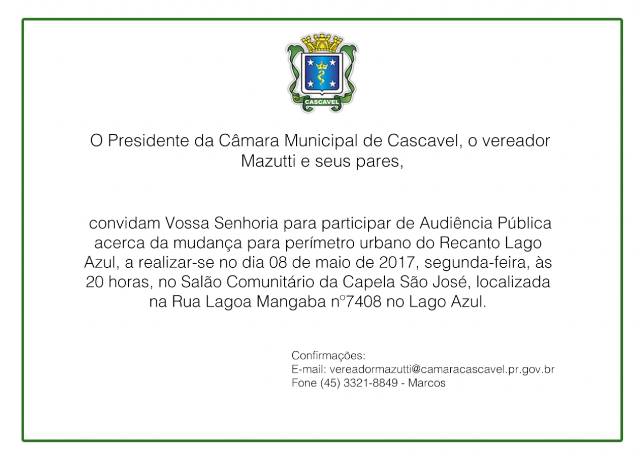 Na próxima segunda-feira (08) a Câmara de Vereadores de Cascavel promove uma audiência pública com os moradores do Bairro Lago Azul. O evento, realizado a pedido dos vereadores Sidnei Mazutti (PSL), Alécio Espínola (PSC), Policial Madril (PMB), Parra (PMDB), Celso Dal Molin (PR), Valdecir Alcântara (PSL) e Josué de Souza (PTC) acontecerá nas dependências do Salão da Capela São José e terá na pauta a questão da mudança para perímetro urbano do local.