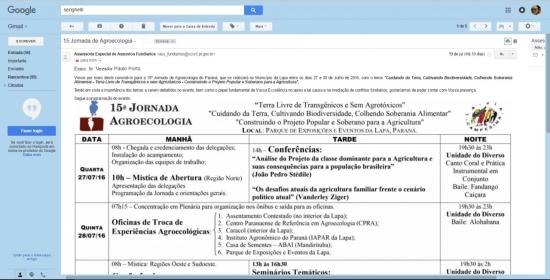 O convite para o vereador Paulo Porto participar do evento – que acontece anualmente no Paraná desde 2002 – partiu do Assessor de Assuntos Fundiários, Hamilton Serighelli, (conforme anexo) devido a importância do tema e do parlamentar ter tido um papel importante na mediação de conflitos agrários na região de Cascavel, em especial na situação envolvendo a ocupação da Fazenda Castelo, no distrito de Rio do Salto, e também por ser autor de lei municipal que restringe o uso de agrotóxicos perto de escolas, CMEIS, postos de saúde e núcleos residenciais rurais.