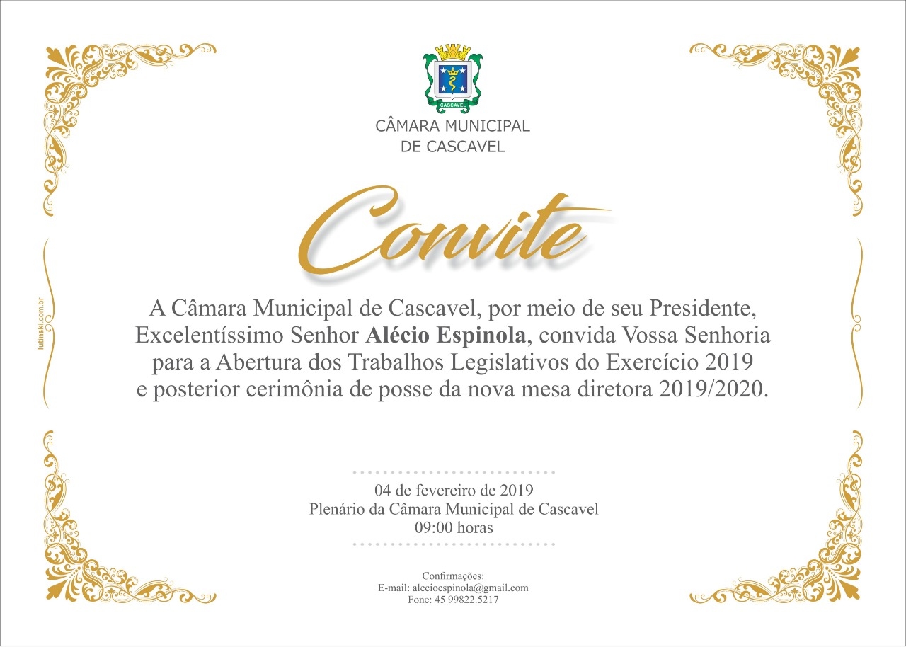 A nova composição da Mesa Diretora que comandará a Câmara de Cascavel nos anos de 2019/2020 foi definida em julho do ano passado e definiu os vereadores Alécio Espínola/PSC, presidente, Roberto Parra/MDB, 1º vice-presidente, Valdecir Alcântara/PSL, 2º vice-presidente, Aldonir Cabral/PDT, 1º secretário e Paulo Porto/PCdoB, 2º secretário. Os vereadores já atuam nas respectivas funções desde o dia 1º de janeiro, porém, a posse oficial acontece na próxima segunda-feira, 04 de fevereiro, às 9h, dia da primeira sessão do ano.