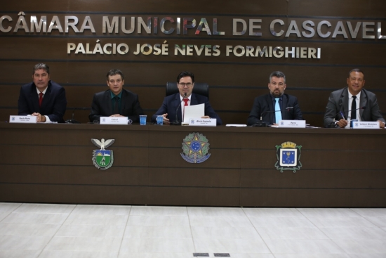 Neste dia 04 de fevereiro a Câmara de Cascavel retomou suas atividades após o recesso parlamentar e realizou a primeira sessão do ano já com a nova Mesa Diretora da Casa. A posse dos vereadores Alécio Espínola/PSC, presidente, Roberto Parra/MDB, 1º vice-presidente, Valdecir Alcântara/PSL, 2º vice-presidente, Aldonir Cabral/PDT, 1º secretário e Paulo Porto/PCdoB, 2º secretário aconteceu antes da sessão com a presença do prefeito Leonaldo Paranhos, secretários municipais, representantes da Polícia Civil, Militar e Corpo de Bombeiros, associações de bairro, faculdades e entidades da sociedade civil.