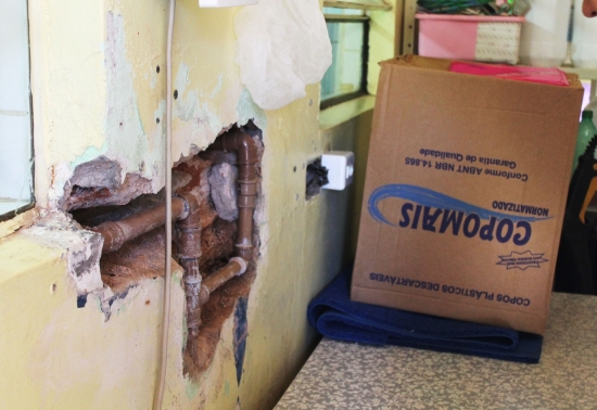 A cozinha do CMEI é outro problema. Com um único acesso, uma porta estreita com um forno na parte de trás da entrada, a cozinha já foi alvo de uma vistoria da Medicina do Trabalho que emitiu um laudo de sofrimento térmico das duas cozinheiras que atendem na unidade, uma das trabalhadoras afastada por atestado. Na área de serviço há problemas no encanamento com infiltrações e nas fiações com incidência de curtos circuitos. A APPS já tentou intervir nessas situações, mas foi informado que somente um engenheiro elétrico da prefeitura estaria autorizado a fazer os reparos.