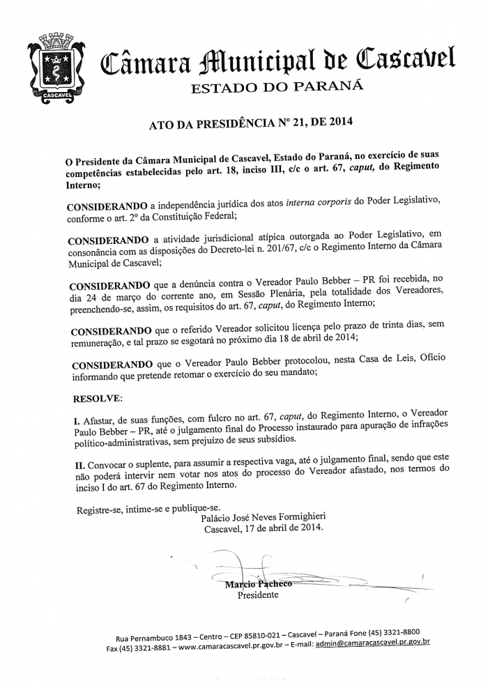 O presidente da Câmara, Marcio Pacheco afastou nesta quinta-feira (17) o vereador Paulo Bebber (PR) até o julgamento final do processo instaurado para apuração de infrações político-administrativas.