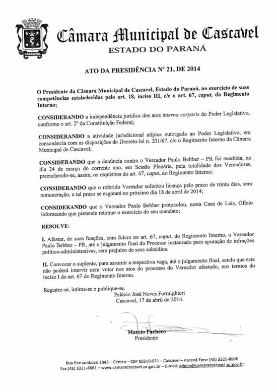 O ato tem fundamento no art. 67 do Regimento Interno que prevê que “o presidente pode afastar de suas funções o vereador acusado desde que a denúncia seja recebida pela maioria absoluta dos membros da Câmara, convocando o respectivo suplente, até o resultado final”.