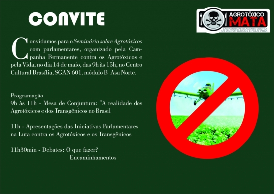 O seminário, que acontecerá no Centro Cultural Brasília a partir das 9 horas, reunirá parlamentares federais, estaduais e municipais com iniciativas parceiras na construção de medidas institucionais e apoio político que favorecem e ampliam a luta contra agrotóxicos e transgênicos.