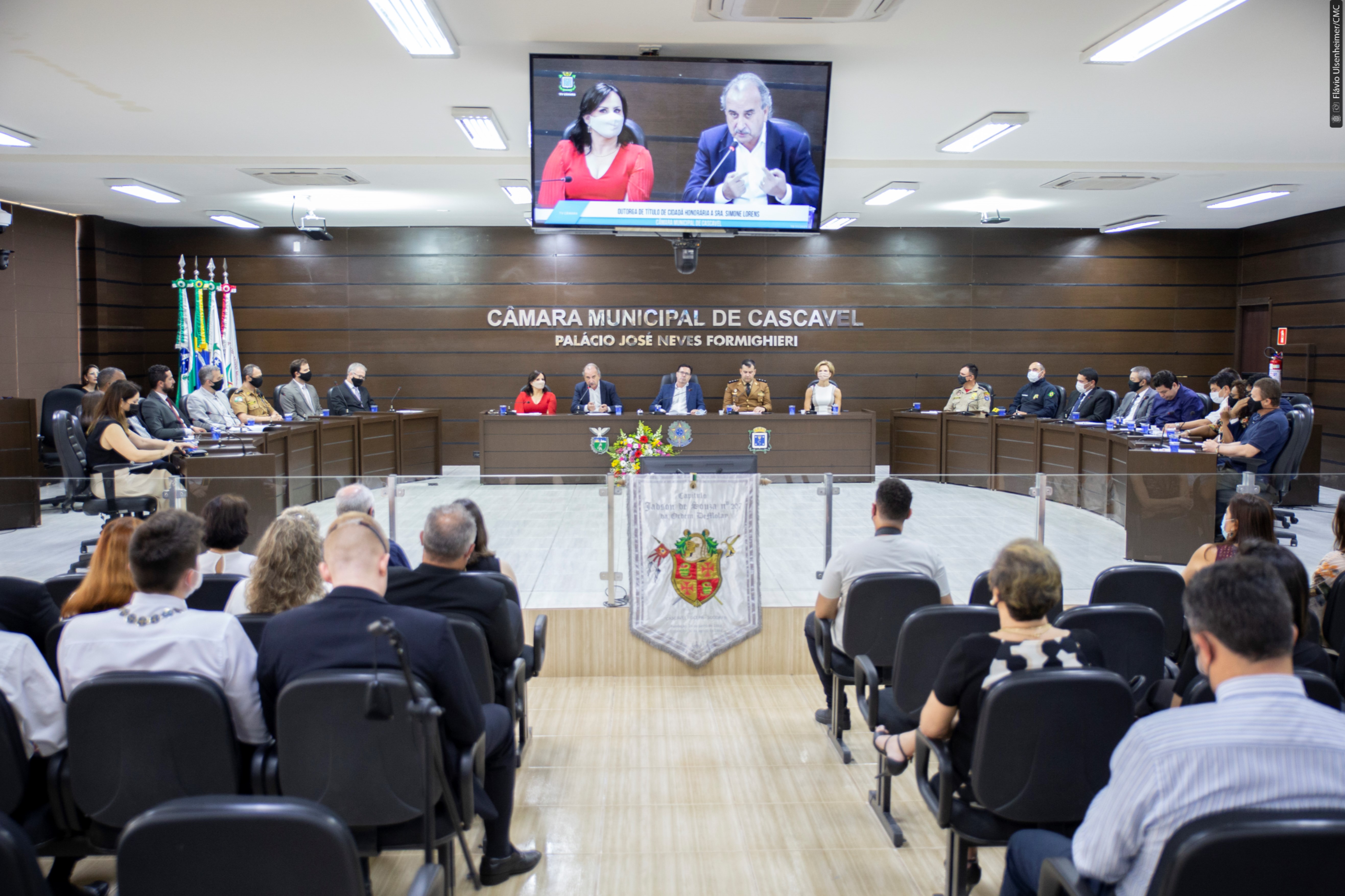 A Câmara Municipal de Cascavel realizou nesta sexta-feira (19) uma sessão solene para entrega do título de cidadã honorária de Cascavel para Simone Lorens, Promotora de Justiça da Comarca de Cascavel, homenagem assinada pela totalidade dos vereadores e vereadoras da Casa.