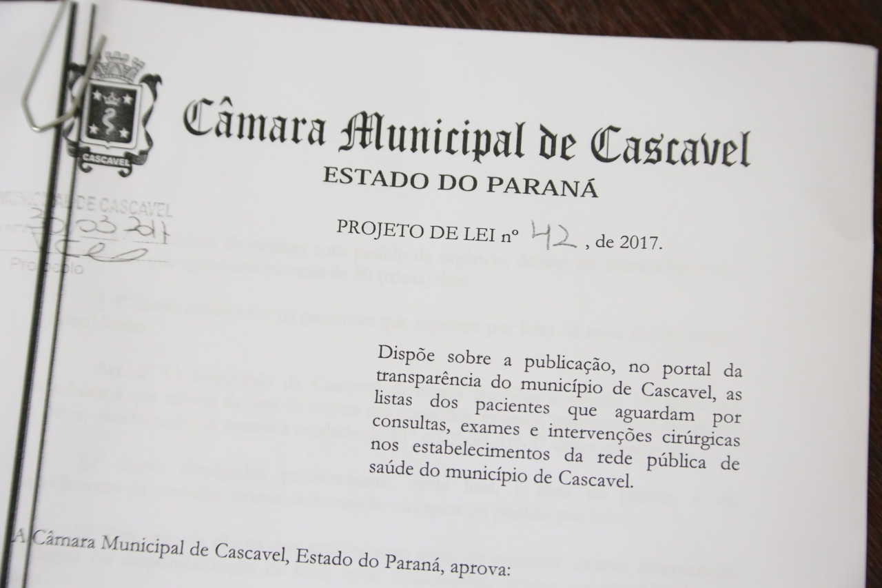Será votado na próxima segunda-feira (15) o Projeto de Lei 42/2017, de autoria dos vereadores Fernando Hallberg (PPL), Policial Madril (PMB), Paulo Porto (PCdoB), Serginho Ribeiro (PPL) e Pedro Sampaio (PSDB) que assegura a divulgação, no Portal da Transparência de Cascavel, da lista dos pacientes que aguardam por consultas, exames e intervenções cirúrgicas nos estabelecimentos da rede pública de saúde do município.
