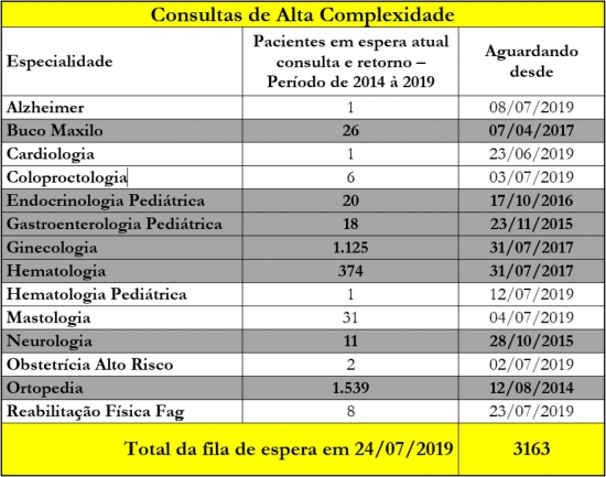 A assessoria parlamentar analisou as consultas de alta complexidade e notou que há pacientes aguardando desde agosto de 2014 encaminhamento para, por exemplo, ortopedia, com 1,5 mil pacientes na fila. Ainda foi constatado pacientes aguardando desde 2015 para neurologia e gastroenterologia pediátrica. Os dados também mostram 1,1 mil pacientes aguardando na fila de ginecologia desde 2016.