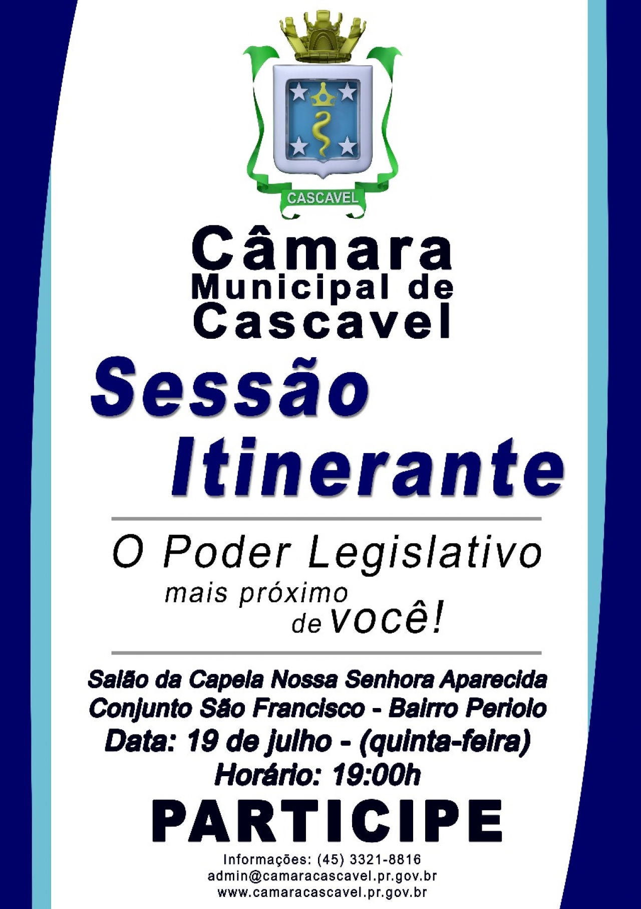O presidente da Câmara Gugu Bueno (PR) confirmou para o próximo dia 19 de julho (quinta-feira), a segunda sessão itinerante desta legislatura. A sessão acontece no Conjunto São Francisco, Bairro Periolo, às 19h, no salão anexo à Capela Nossa Senhora Aparecida, situado à Rua África, esquina com El Salvador.