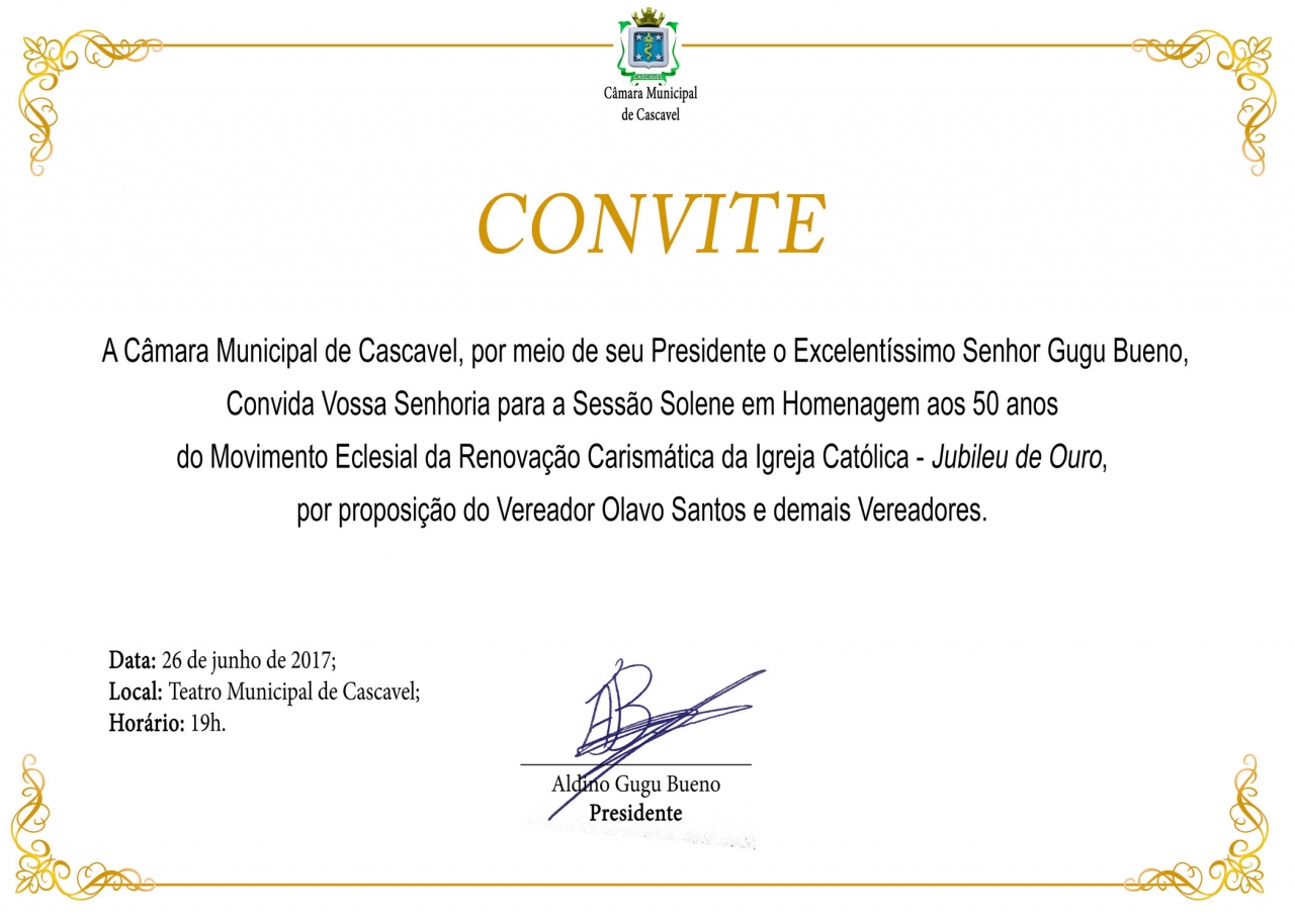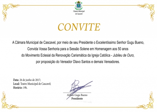 A Câmara de Cascavel realiza na próxima segunda-feira (26) uma sessão solene em comemoração ao Jubileu de Ouro - 50 anos da Renovação Carismática da Igreja Católica. A cerimônia acontece no Teatro Municipal, a partir das 19h.