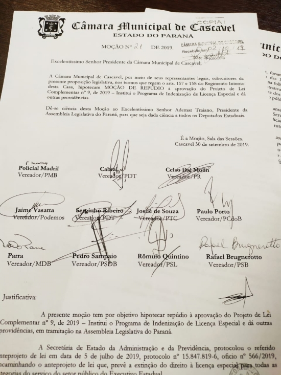 O vereador Policial Madril (PMB) protocolou nesta quarta-feira (02) a Moção 21/2019, endereçada ao presidente da Assembleia Legislativa do Paraná, Ademar Traiano, expressando repúdio à aprovação do projeto de Lei Complementar nº 09/2019, que instituiu o Programa de Indenização de Licença Especial para servidores do Paraná. A moção recebeu o apoio dos vereadores Cabral, Celso Dal Molin, Jaime Vasatta, Serginho Ribeiro, Josué de Souza, Paulo Porto, Parra, Pedro Sampaio, Romulo Quintino e Rafael Brugnerotto.