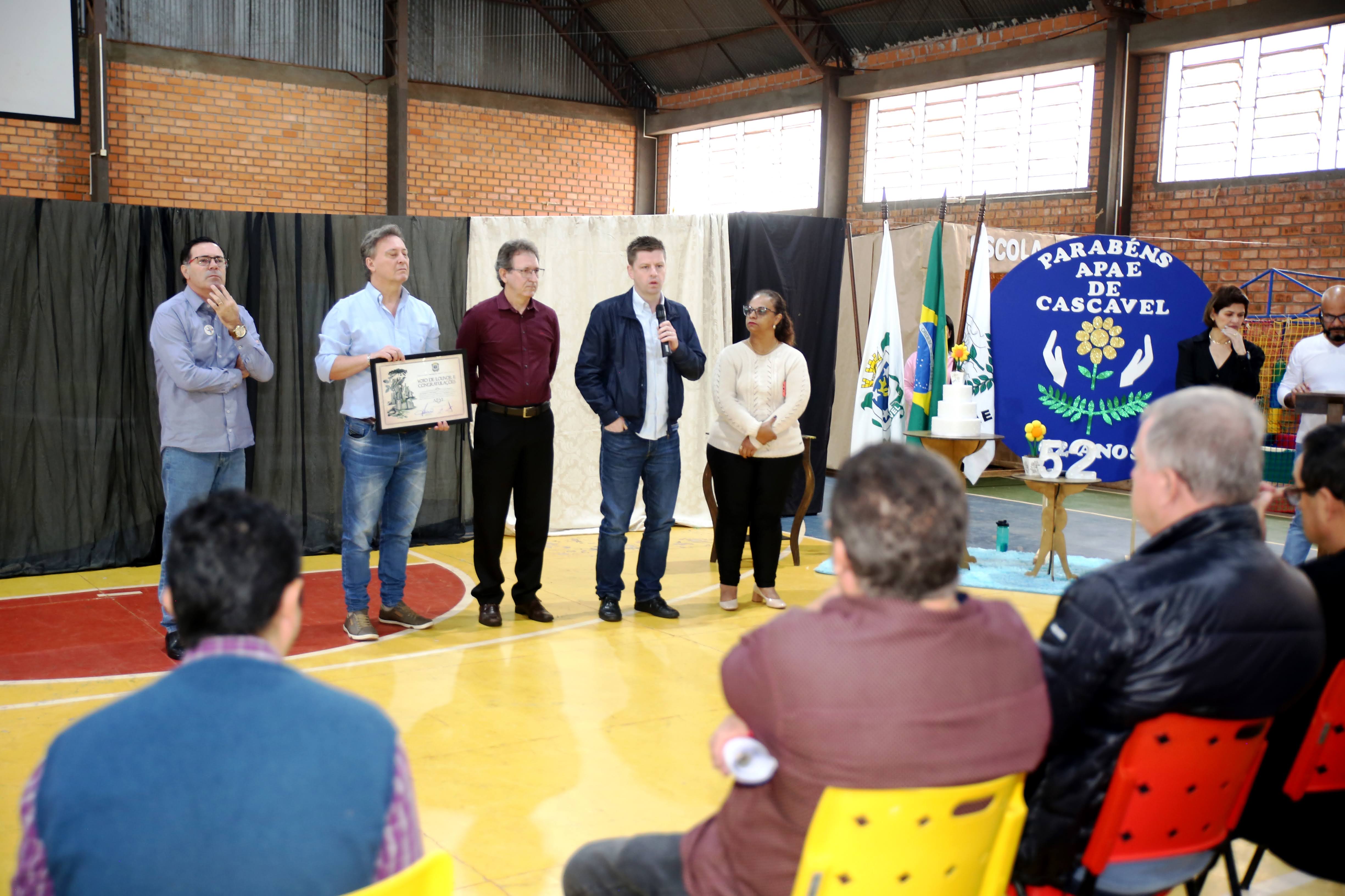 Os vereadores do PSC Mazutti, Alécio Espínola e Pedro Sampaio, proponentes do Voto de Louvor e Congratulações pelos 52 anos de trabalho da Associação de Pais e Amigos dos Excepcionais (Apae) de Cascavel, estiveram na manhã desta quarta-feira (26) na entidade para fazer a entrega da homenagem. Junto com a vereadora Professora Beth Leal (Republicanos), entregaram uma placa comemorativa ao presidente da Apae, João Maschio.